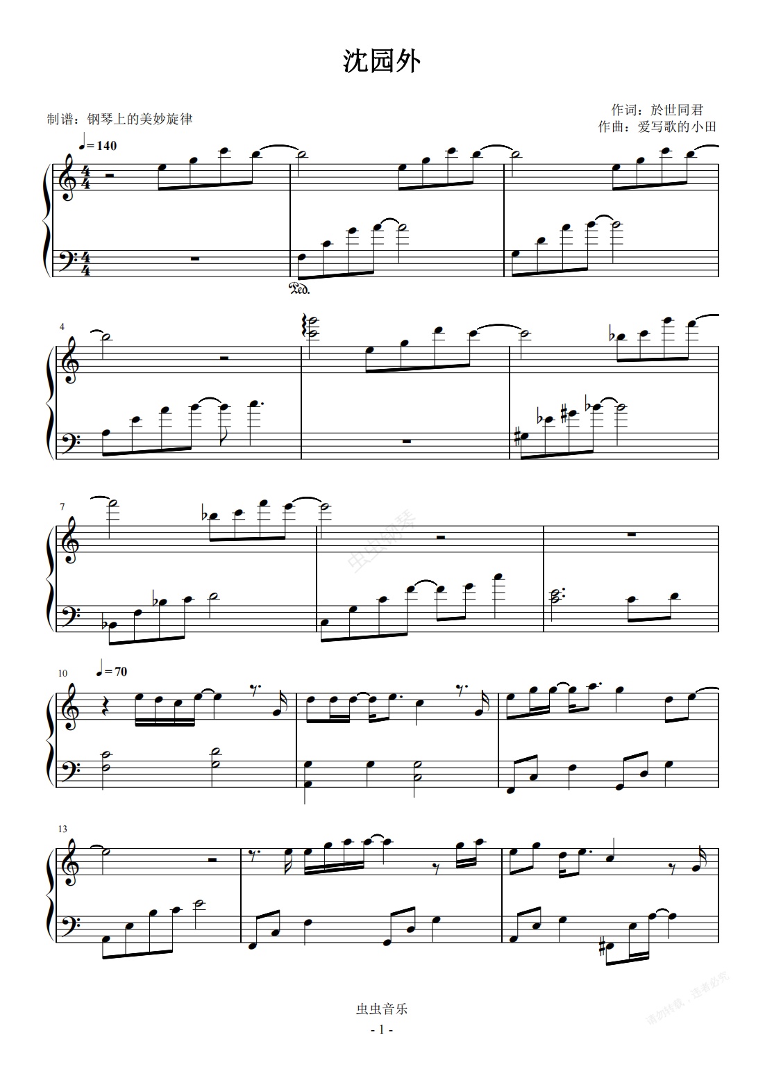 钢琴谱:沈园外 C调简易版 阿YueYue/戾格/小田音乐社