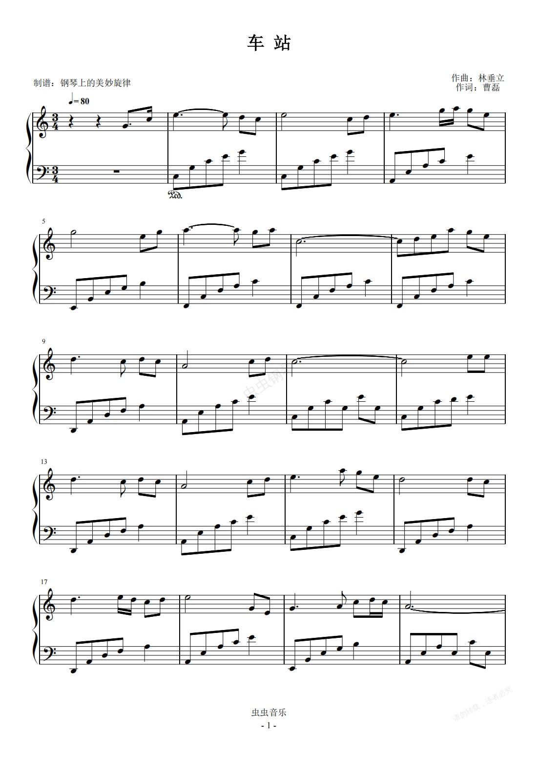 钢琴谱:车站 C调简易版 曹磊 经典流行