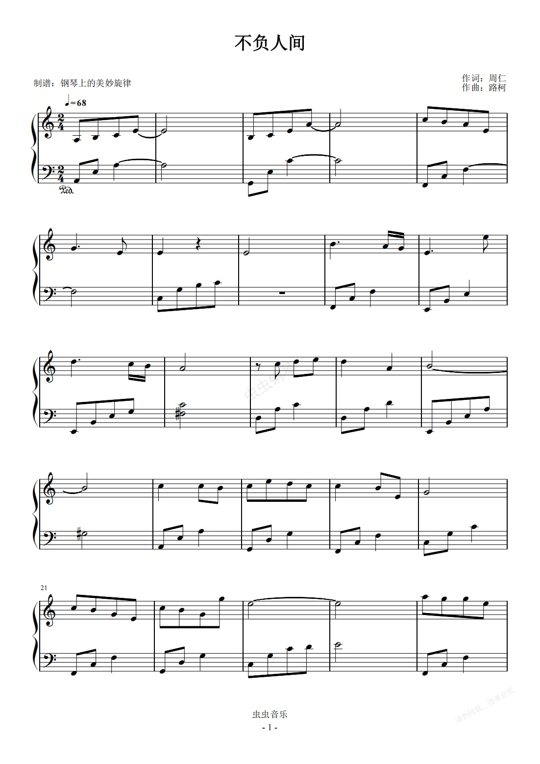 钢琴谱:不负人间 C调简易版 阿YueYue