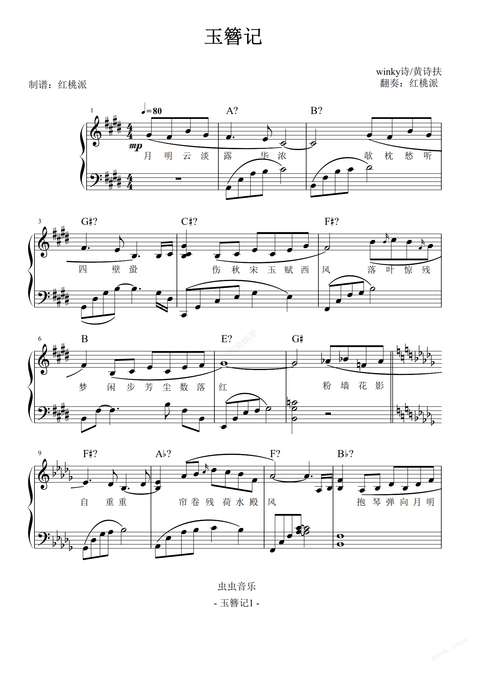 钢琴谱:黄诗扶/Winy诗-玉簪记