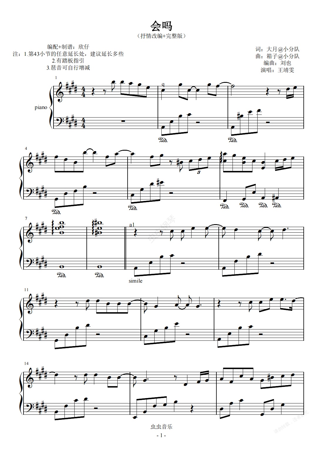 钢琴谱:王靖雯不胖-E《会吗》(抒情改编+完整版)