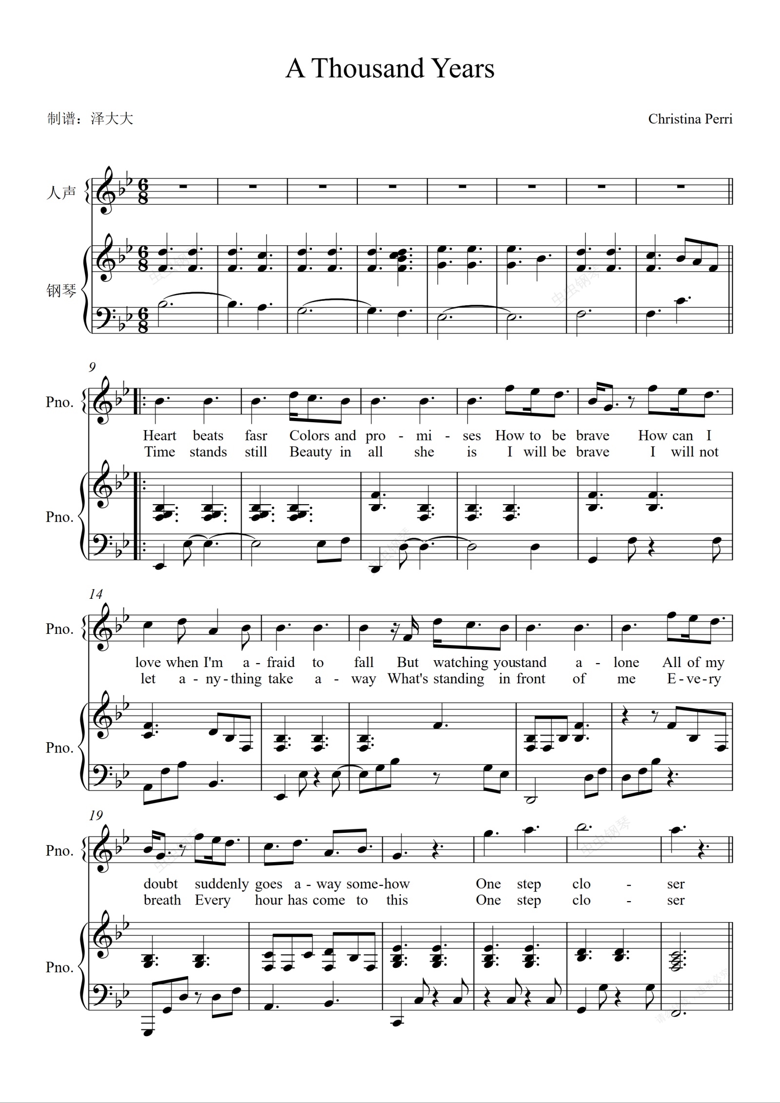 钢琴谱:A Thousand Years【完美弹唱附词】泽大大 暮光之城