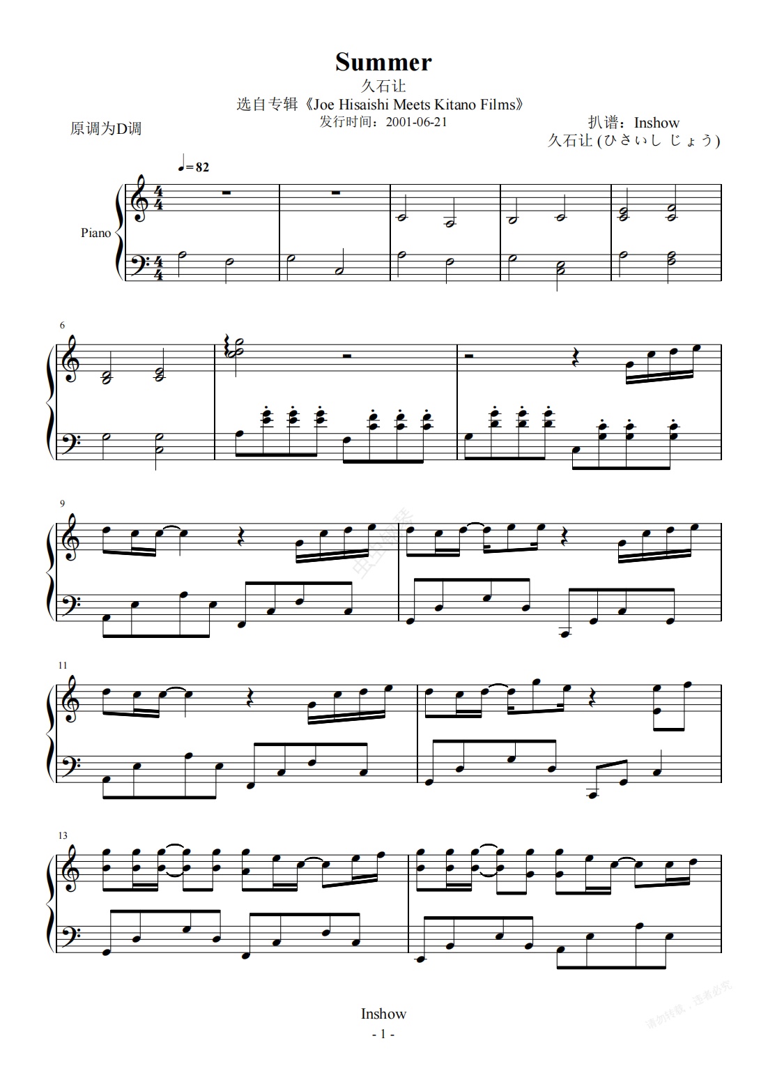 钢琴谱:Summer【C调完整独奏】- 久石让 - 选自专辑《Joe Hisaishi Meets Kitano Films》