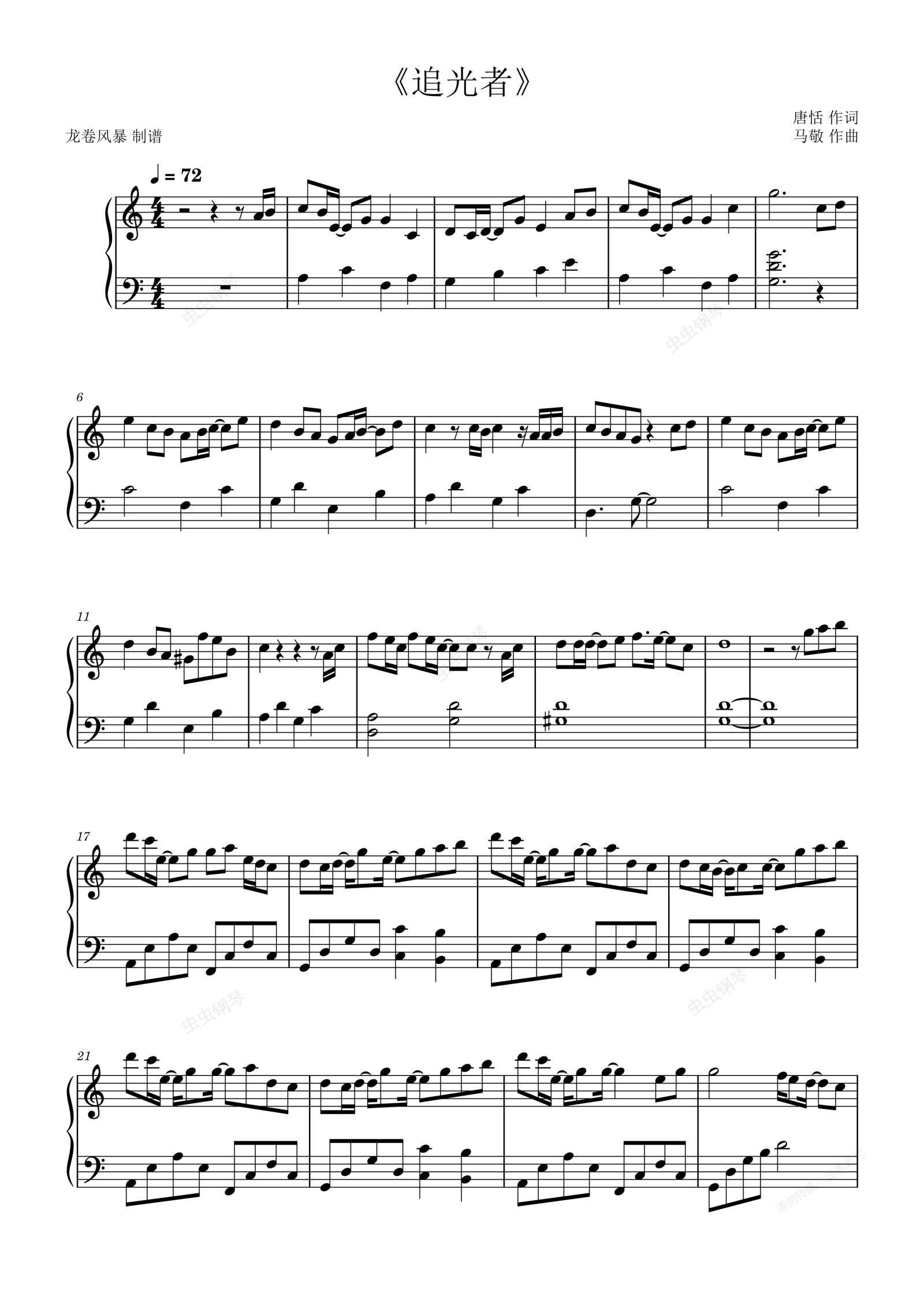 钢琴谱:《追光者》岑宁儿(C调唯美版)