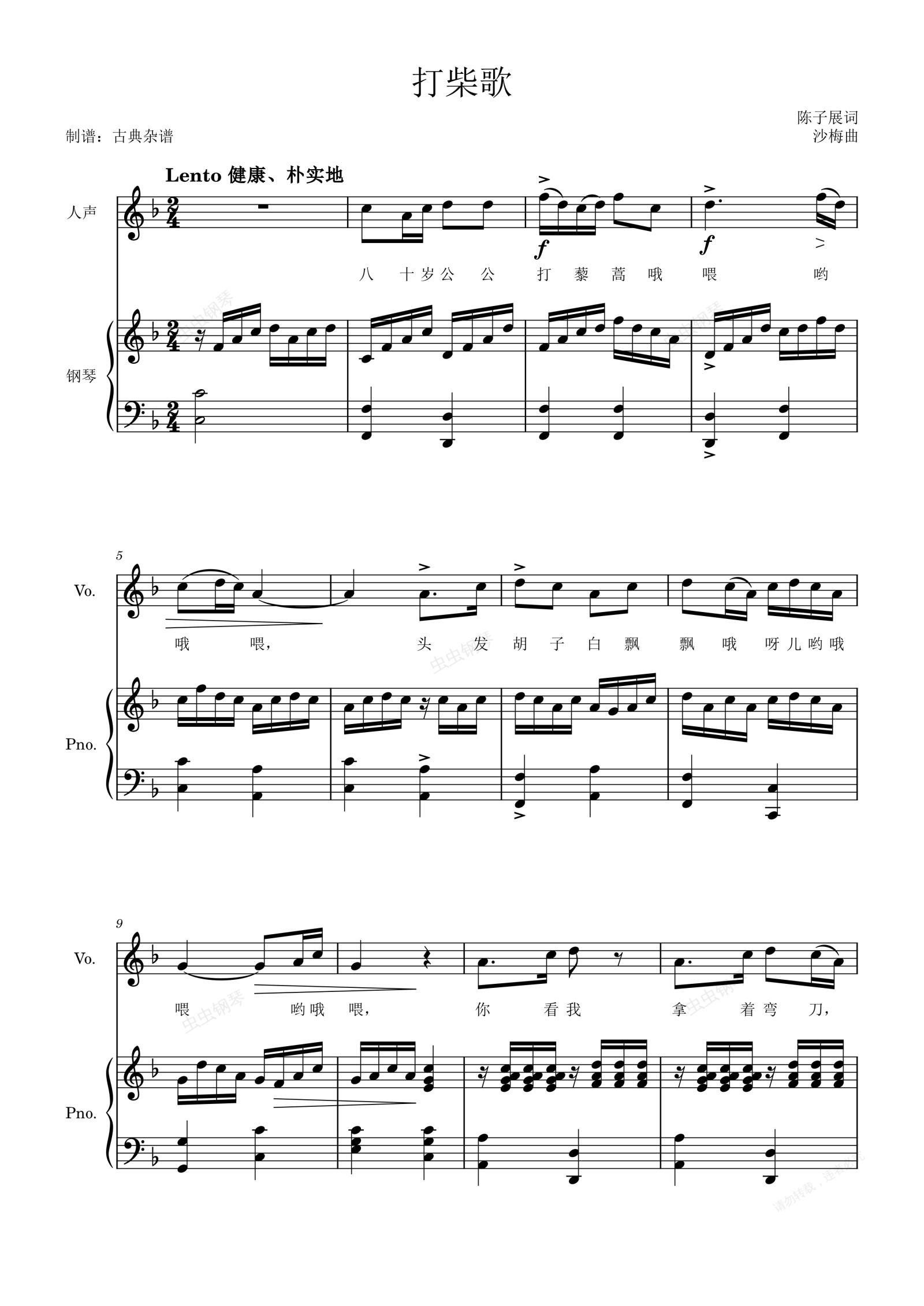 钢琴谱:打柴歌【声乐伴奏谱】陈子展词 沙梅曲