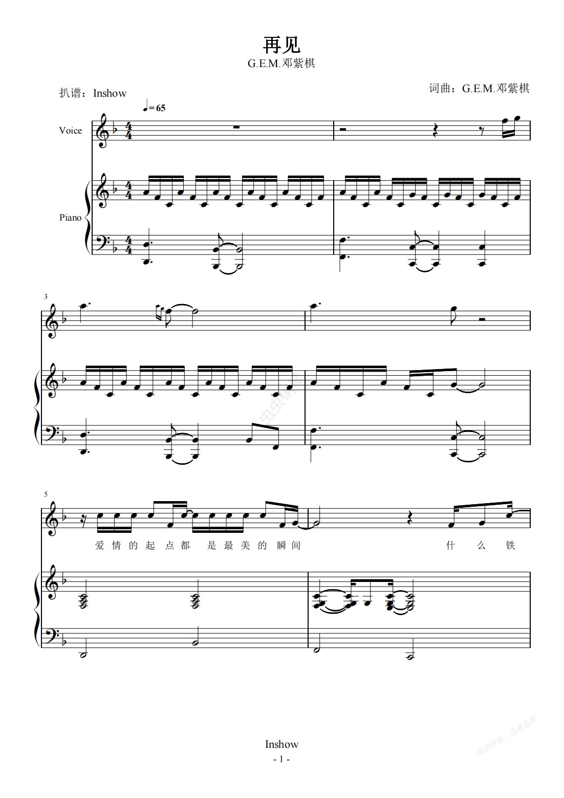 钢琴谱:再见(Live)【F调弹唱】- G.E.M.邓紫棋 -