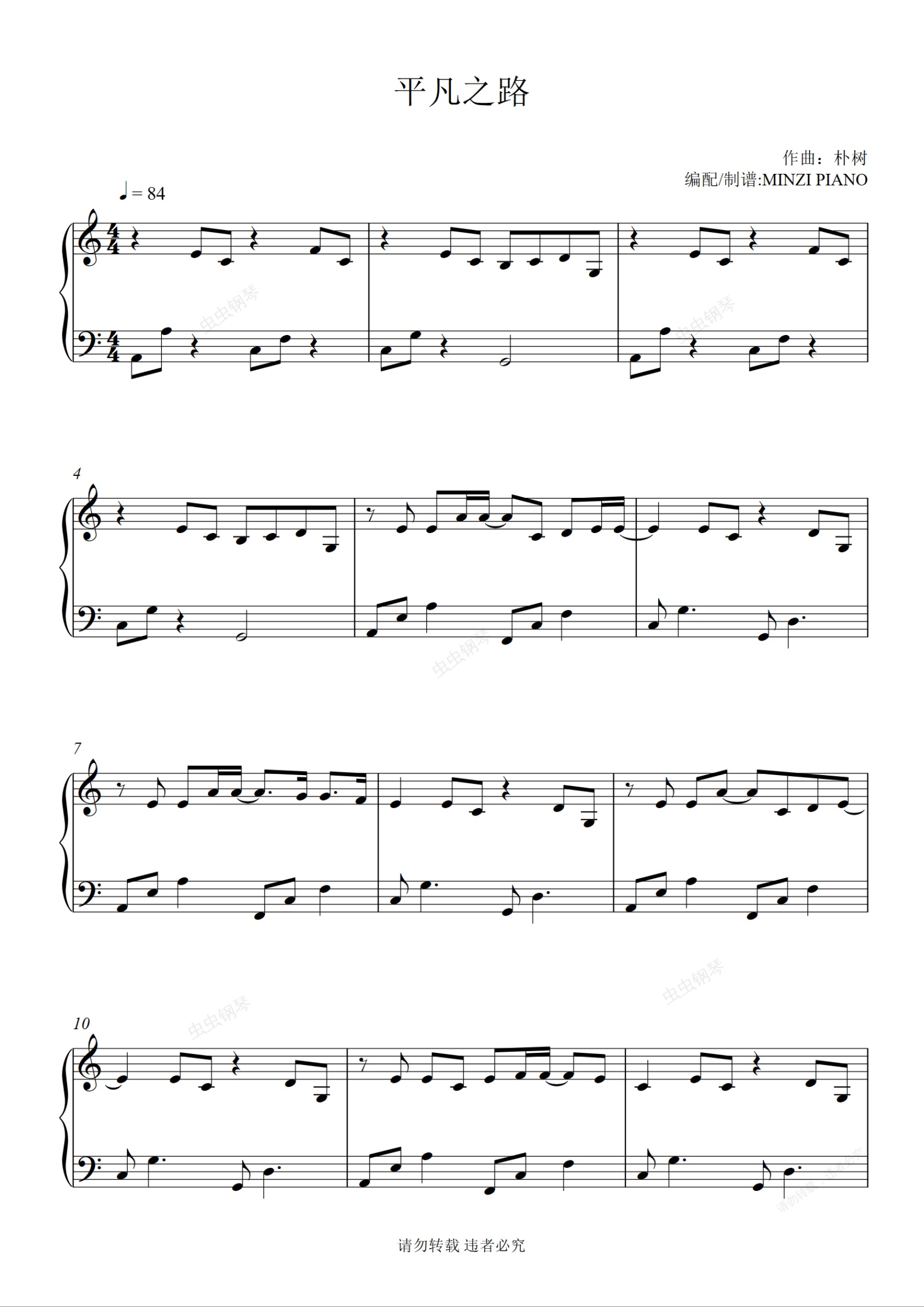 钢琴谱:C调《平凡之路》朴树