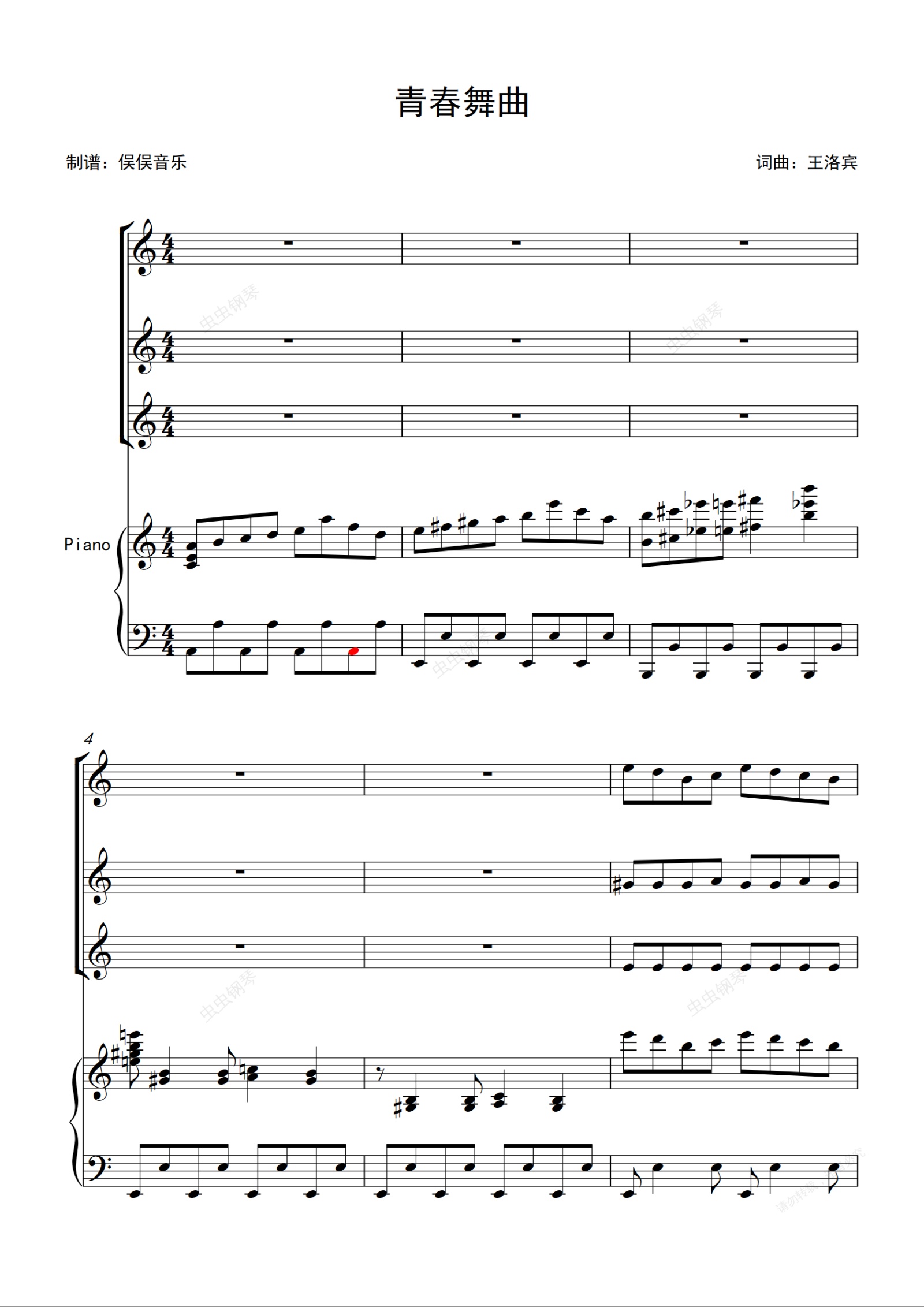 钢琴谱:青春舞曲(三声部合唱伴奏谱)