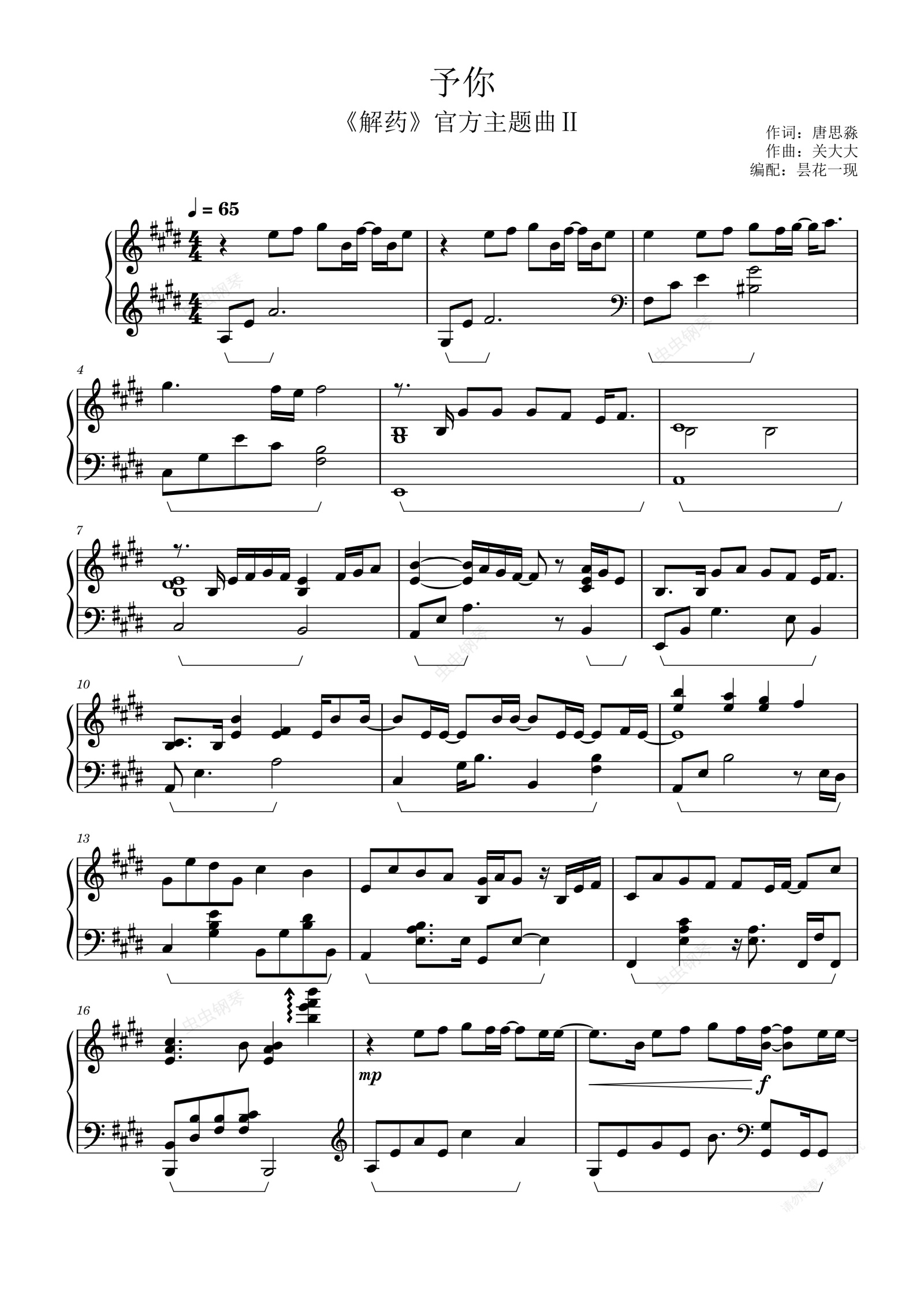 钢琴谱:予你 队长《解药》官方主题曲Ⅱ