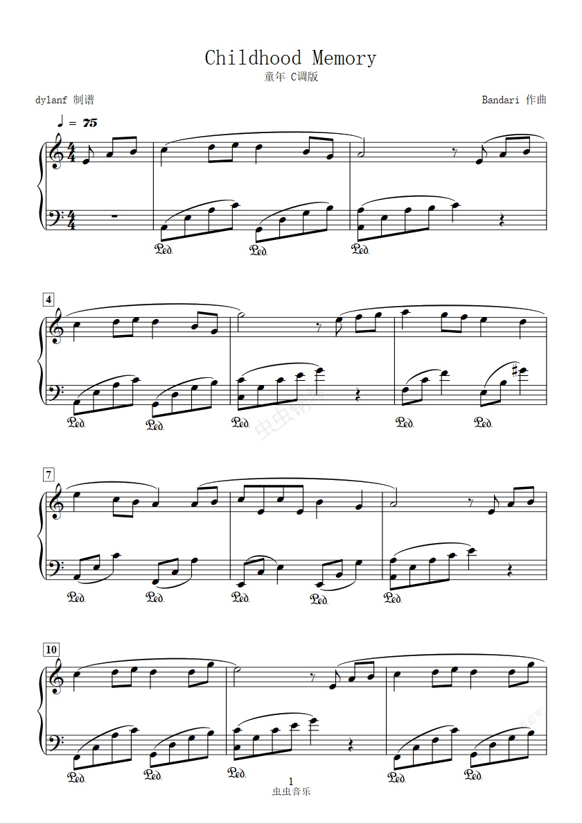 钢琴谱:C调易弹 童年 班得瑞Bandari Childhood Memory 童年的回忆