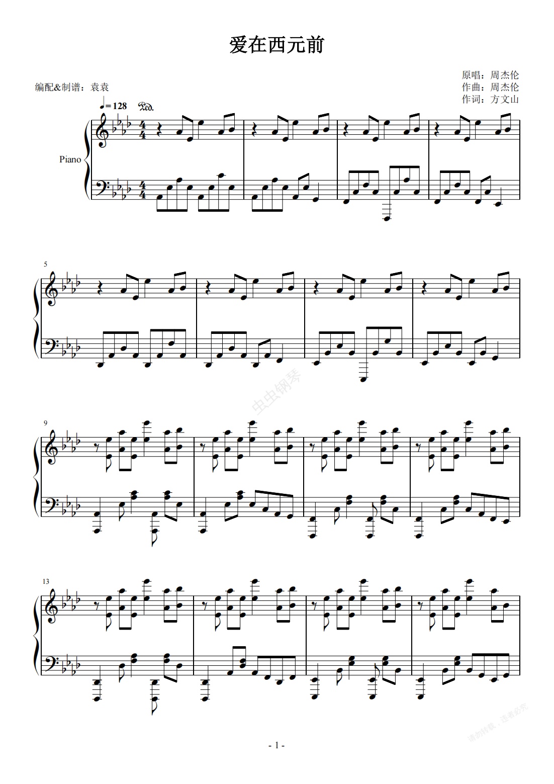 钢琴谱:爱在西元前 原调 简易演奏版