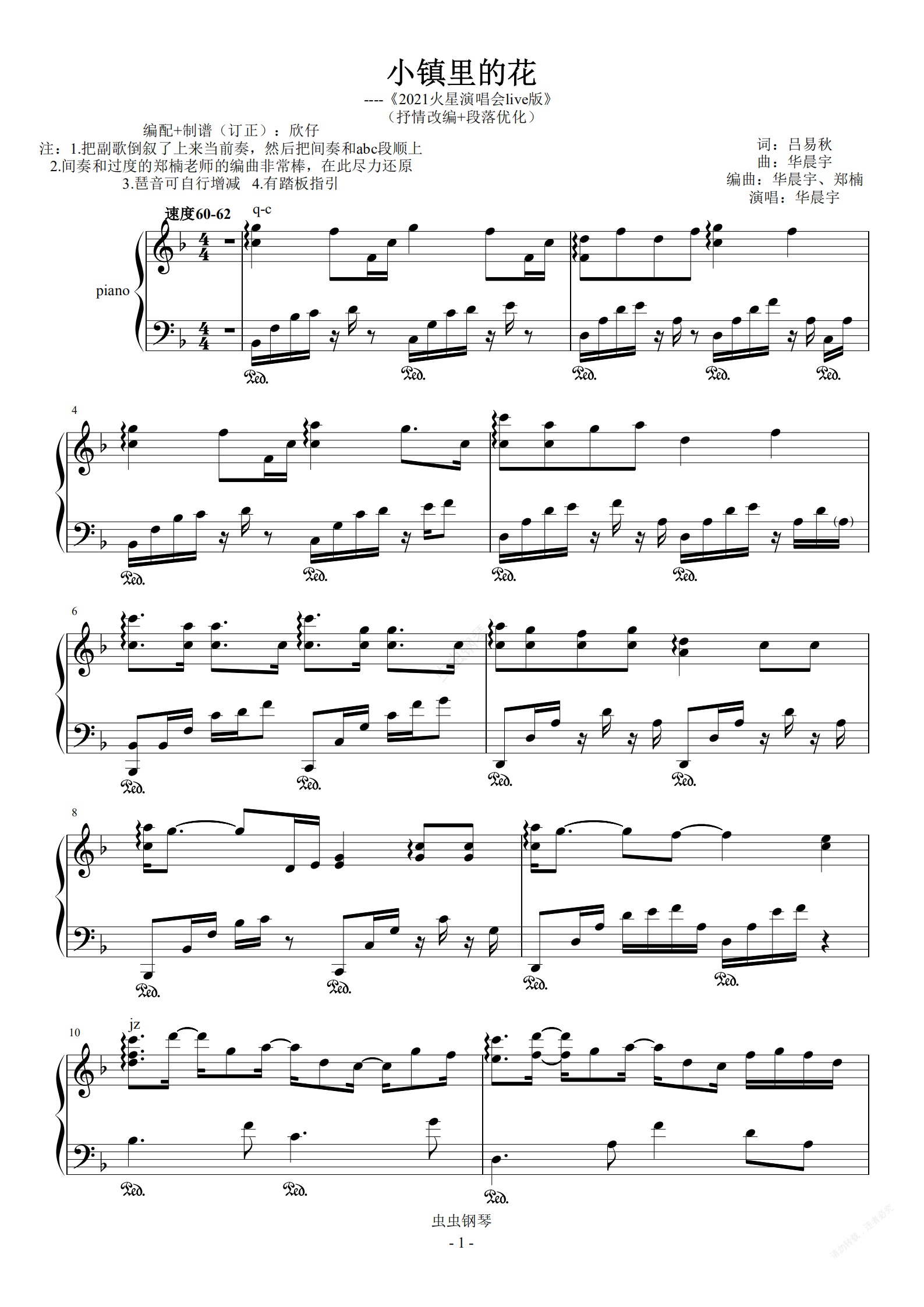 钢琴谱:华晨宇-F《小镇里的花》(抒情改编+段落优化)