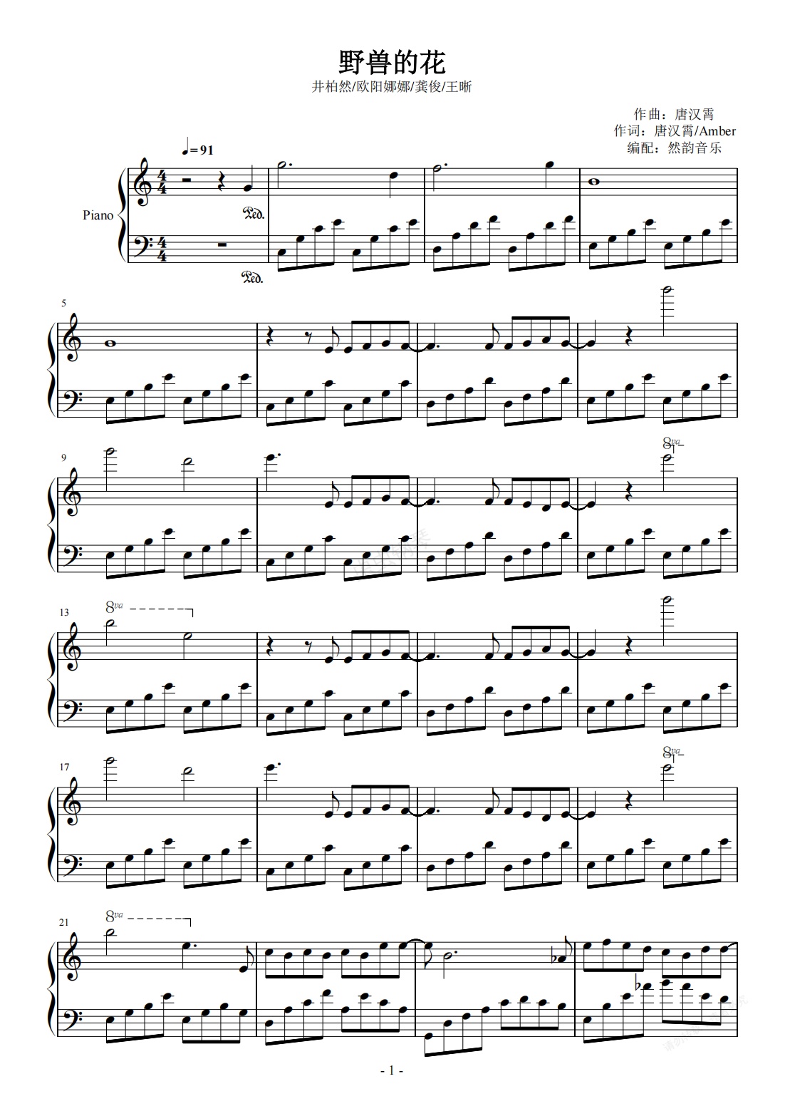 钢琴谱:【C调】野兽的花-井柏然/龚俊/王晰/欧阳娜娜 钢琴完美还原