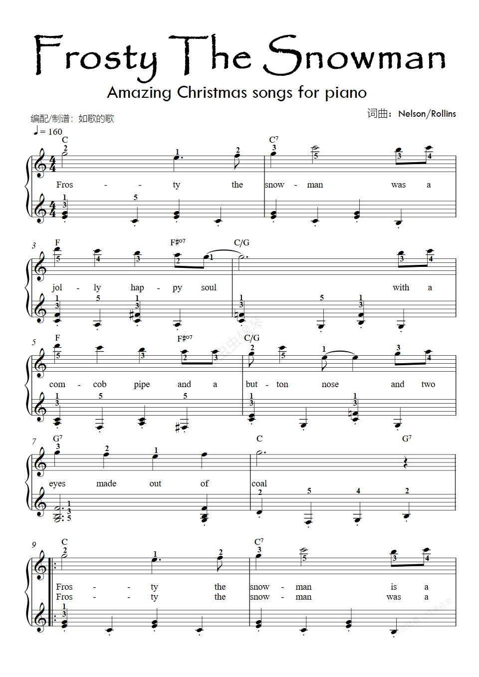 钢琴谱:Frosty the snowmanC大调圣诞祝歌之一歌词指法599程度