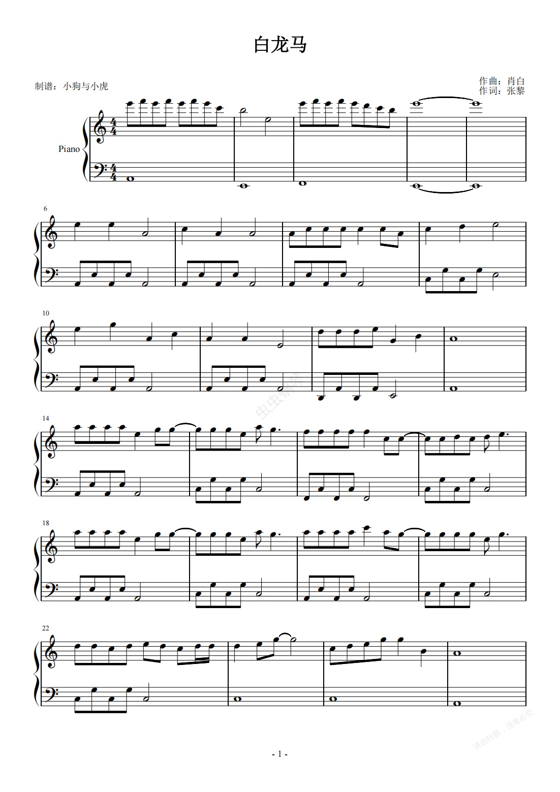钢琴谱:白龙马 C调 简易版