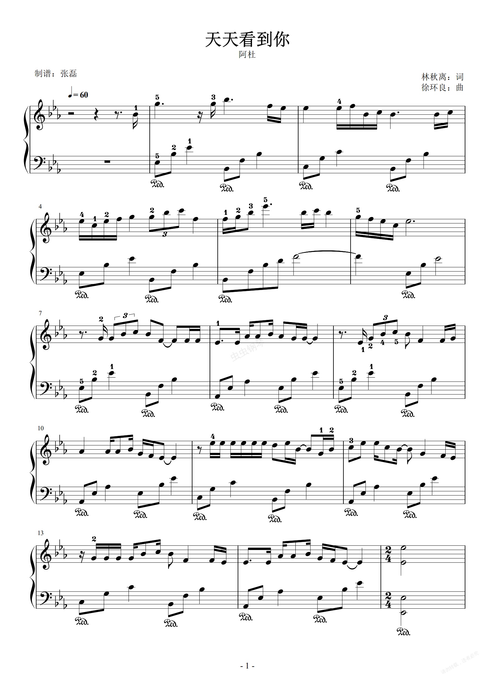 钢琴谱:天天看到你--阿杜--原调