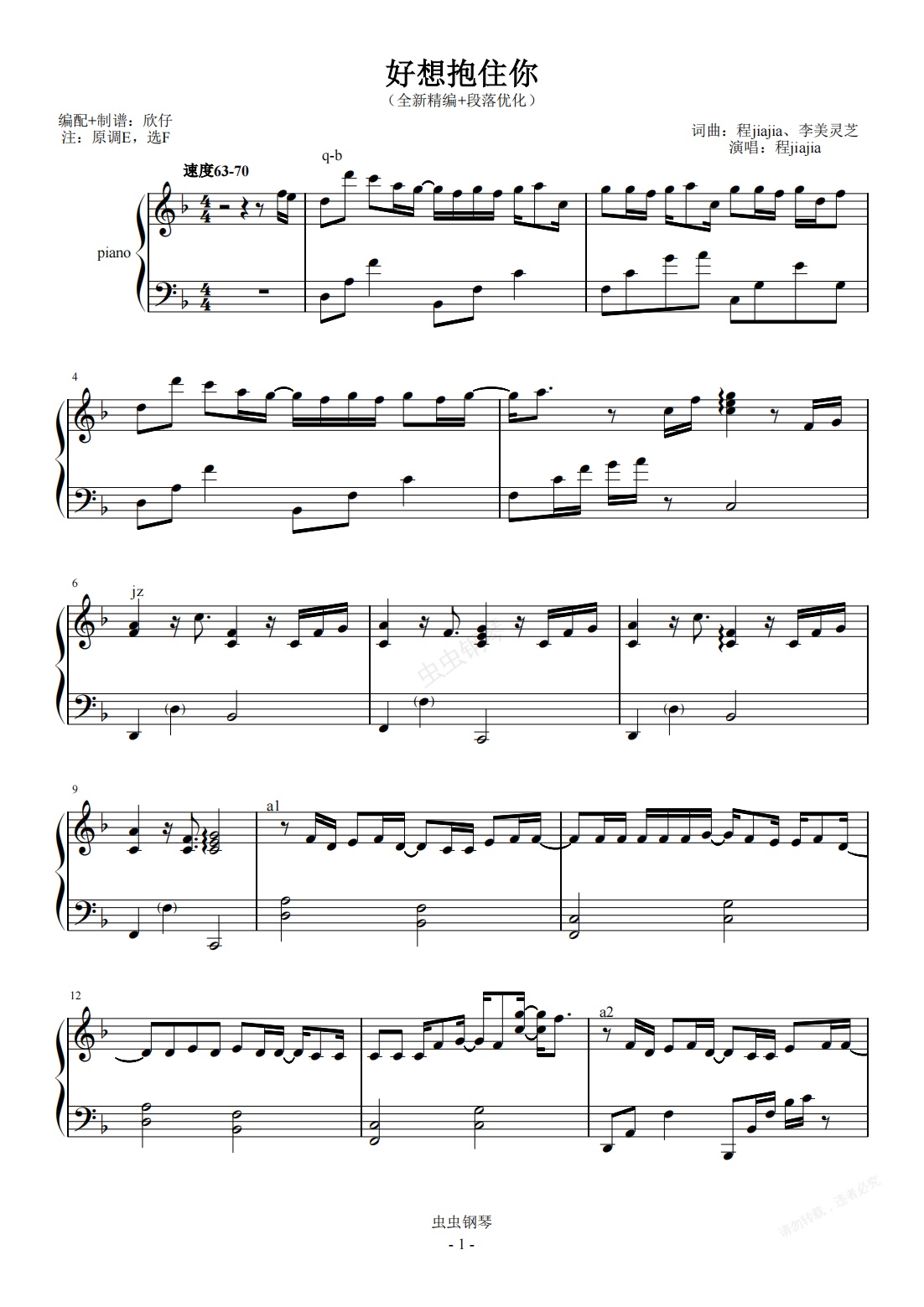 钢琴谱:程jiajia-F《好想抱住你》(全新精编+段落优化)