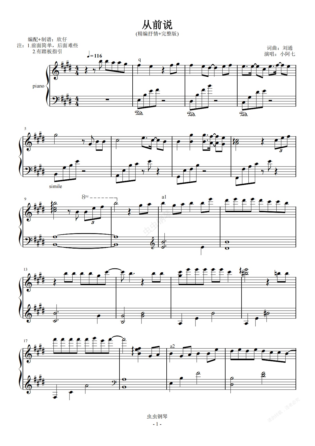 钢琴谱:小阿七-E《从前说》(精编抒情+完整版)