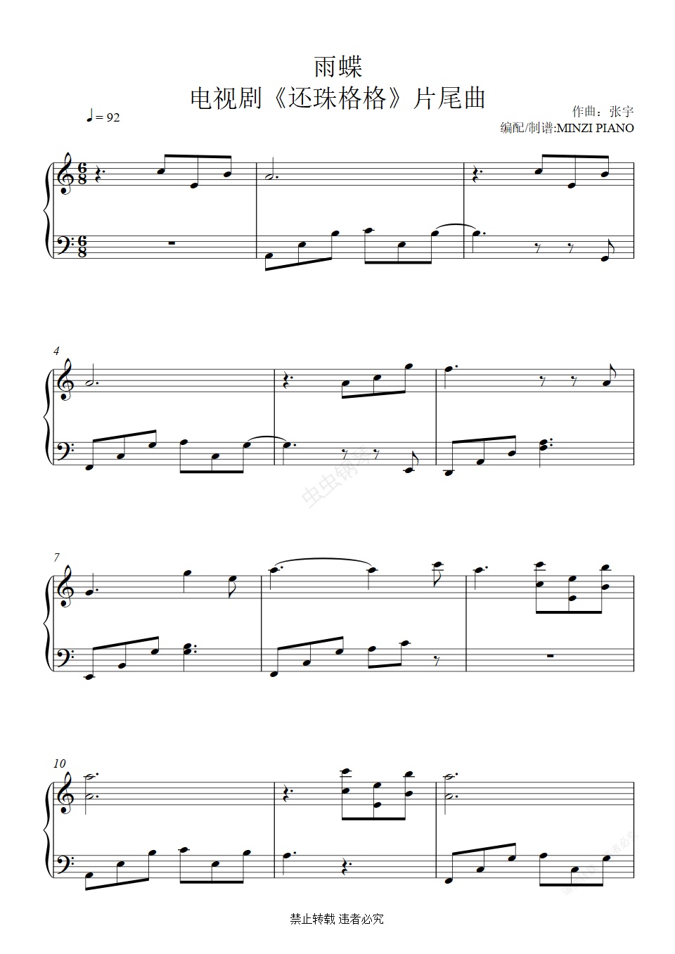 钢琴谱:C调《雨蝶》还珠格格片尾曲