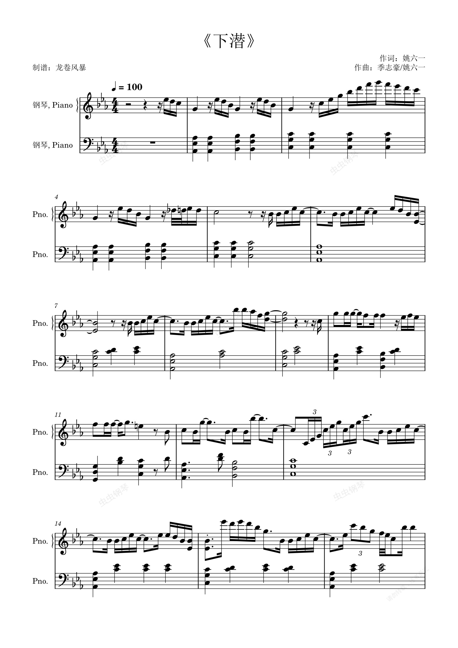 钢琴谱:《下潜》川青/Morerare(巨好听版)