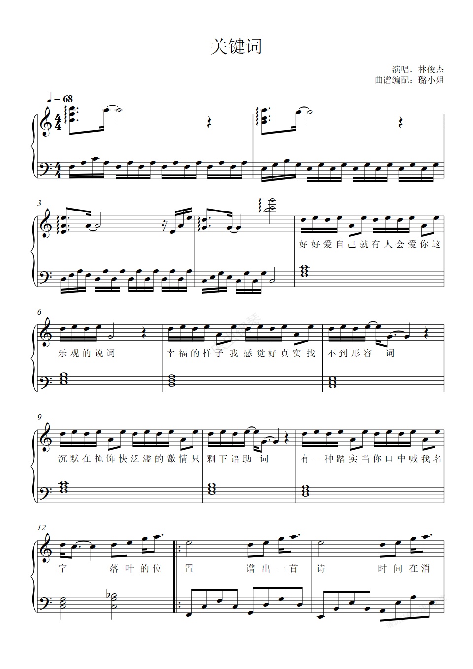钢琴谱:关键词 - C调简单版 - 附歌词