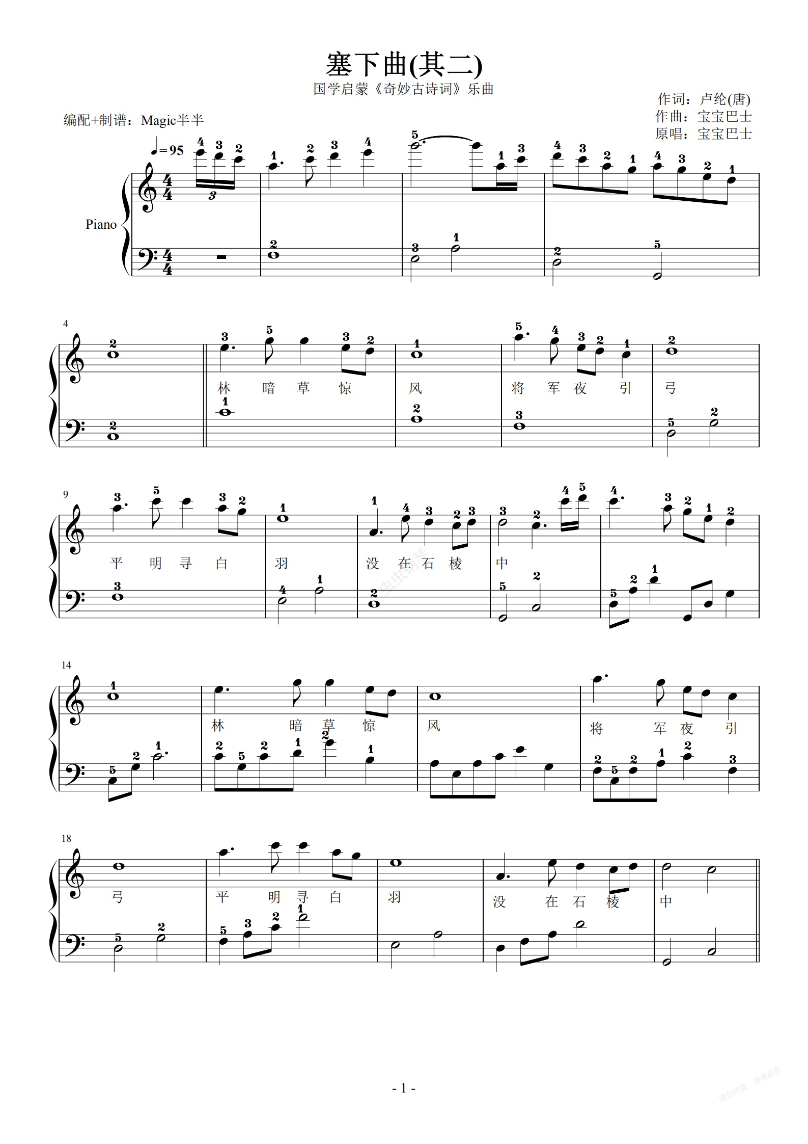 钢琴谱:奇妙古诗词/塞下曲(其二)(带指法)