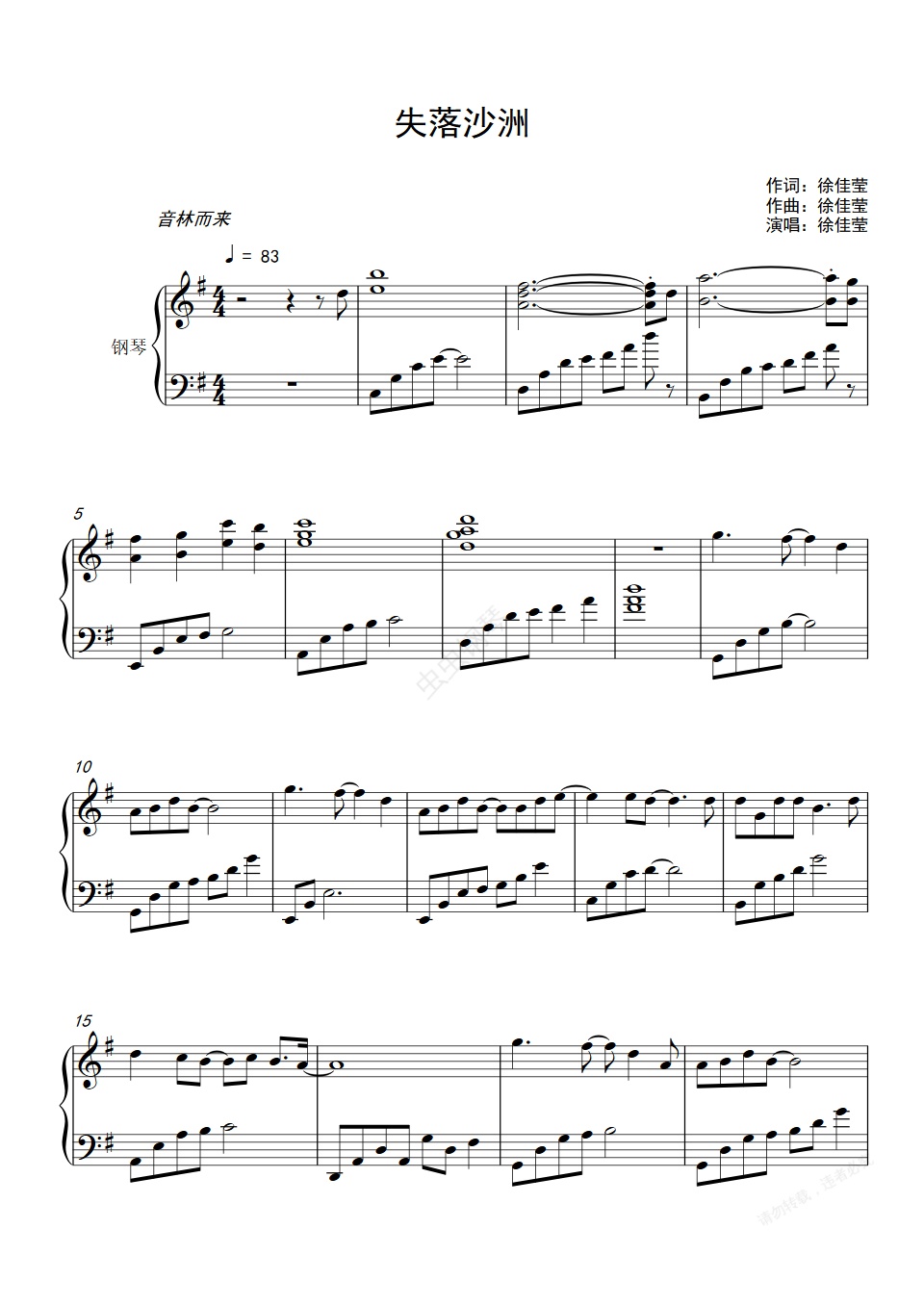 钢琴谱:《失落沙洲》徐佳莹 G调抒情版伴奏 我是歌手