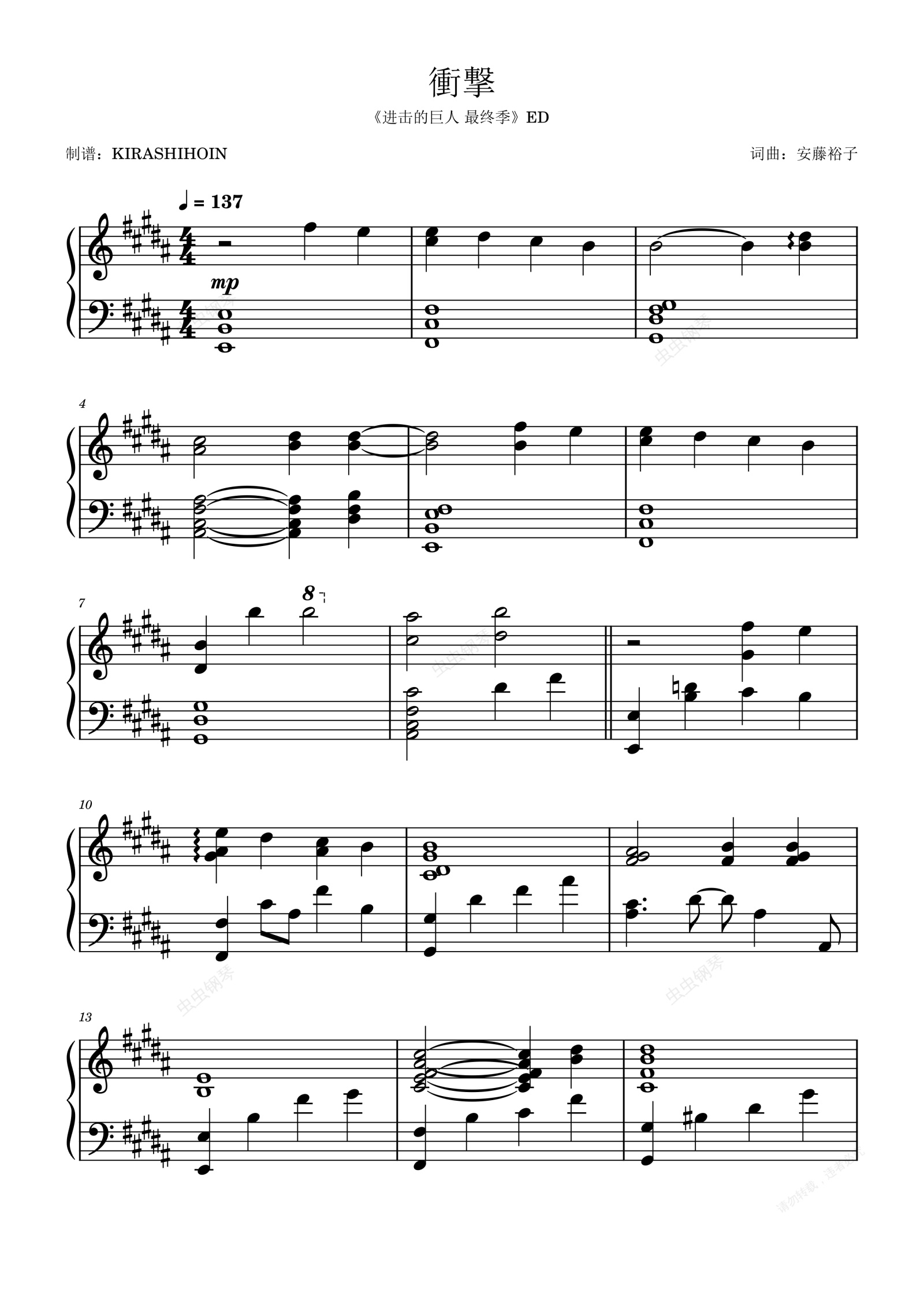 钢琴谱:衝撃(《进击的巨人 最终季》ED/片尾曲)- 安藤裕子