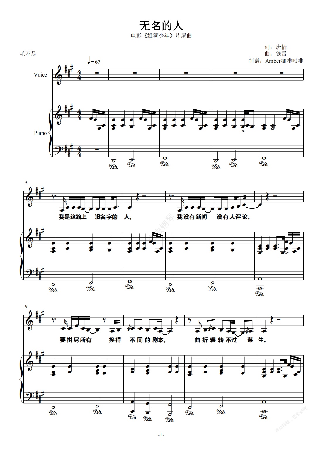 钢琴谱:无名的人 毛不易 钢琴伴奏谱