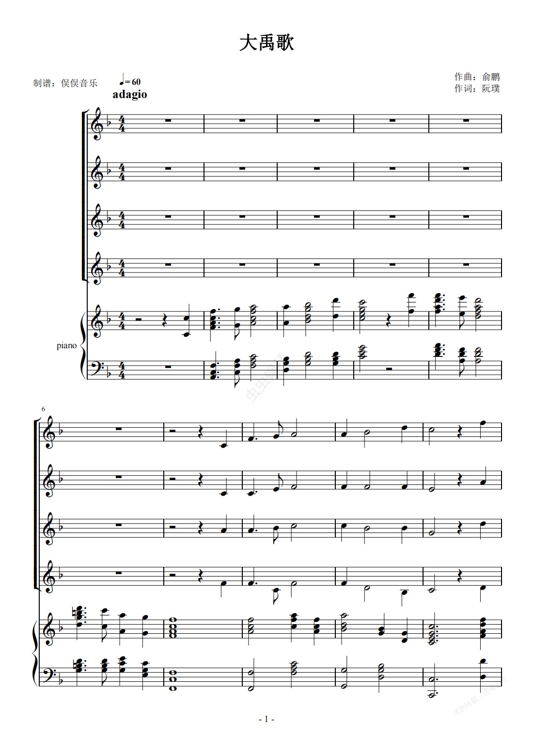 钢琴谱:大禹歌 - 四声部合唱伴奏谱