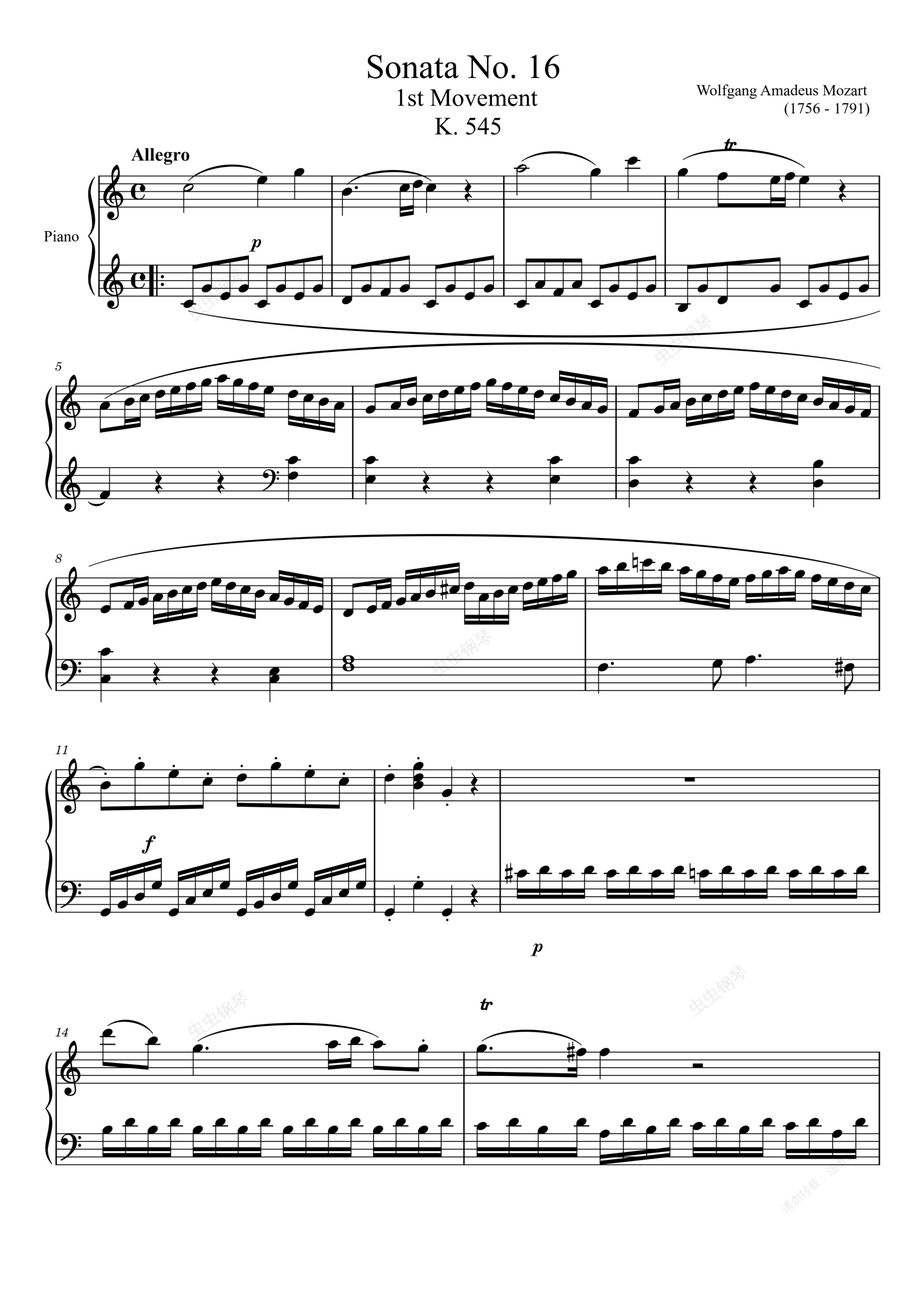 钢琴谱:莫扎特C大调第十六钢琴奏鸣曲 第一乐章K.545 Sonata No. 16, 1st Movement K. 545