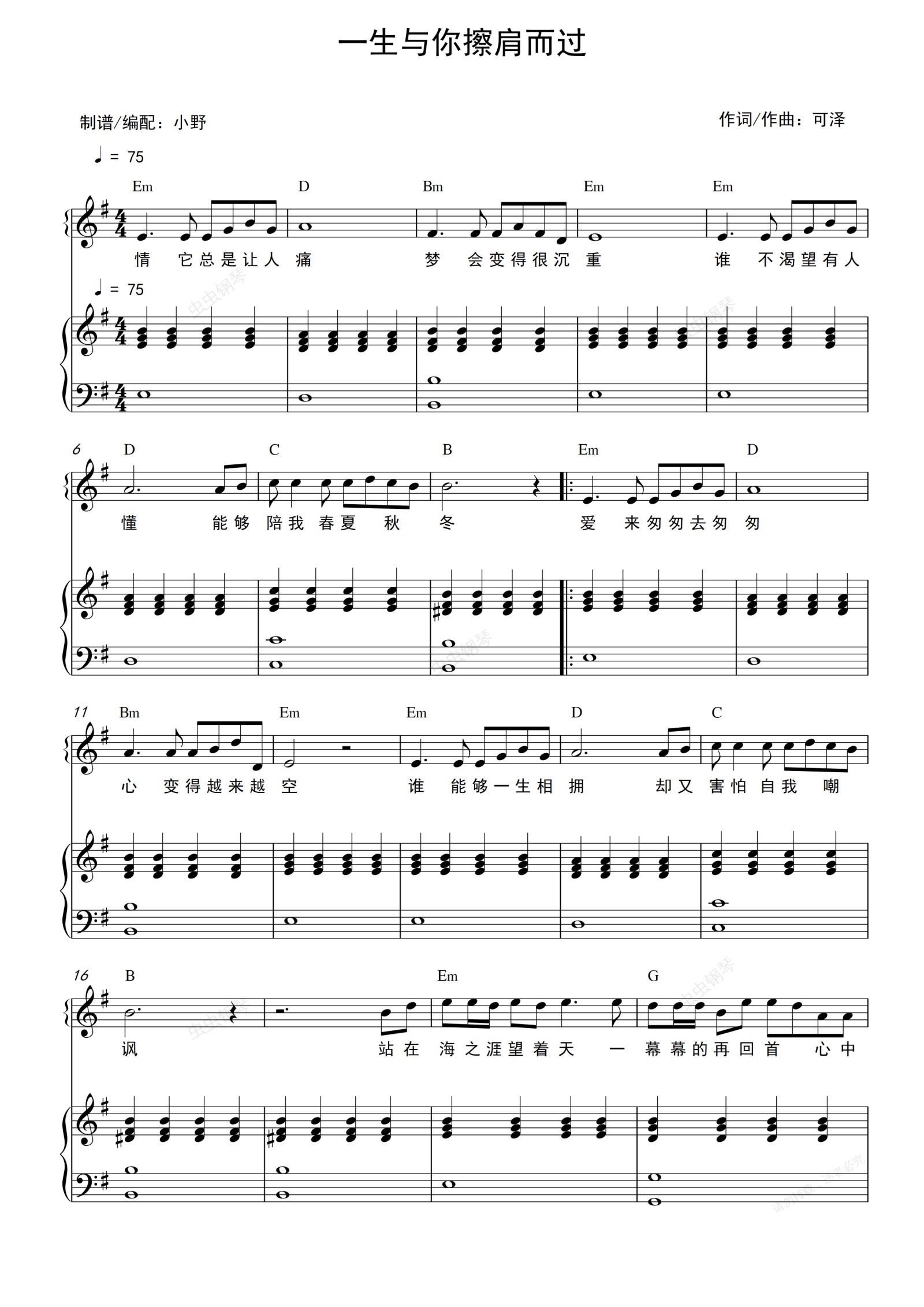 钢琴谱:一生与你擦肩而过(和弦弹唱版)