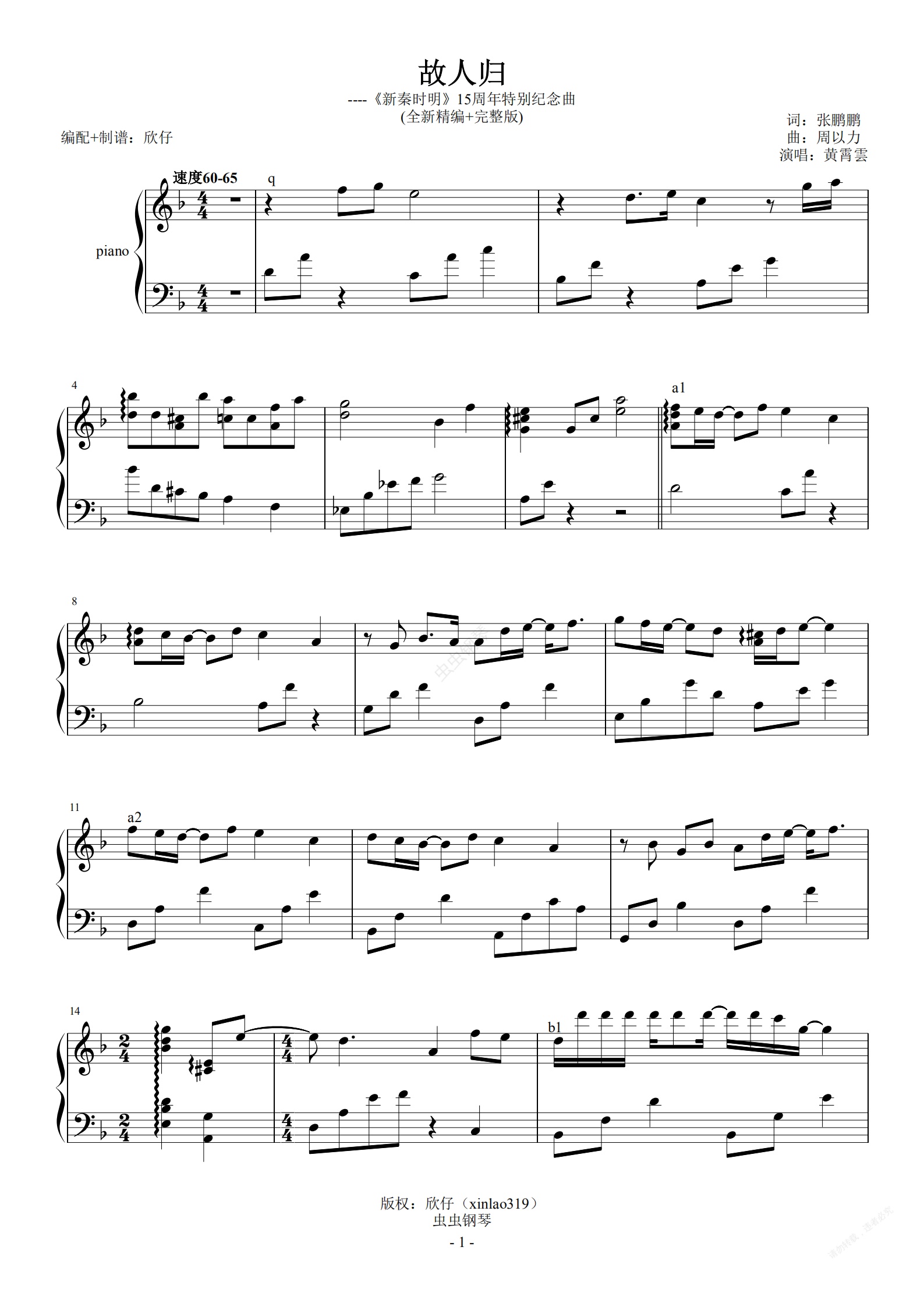 钢琴谱:黄宵雲-F《故人归》(《秦时明月》十五周年特别纪念曲、全新精编+完整版)