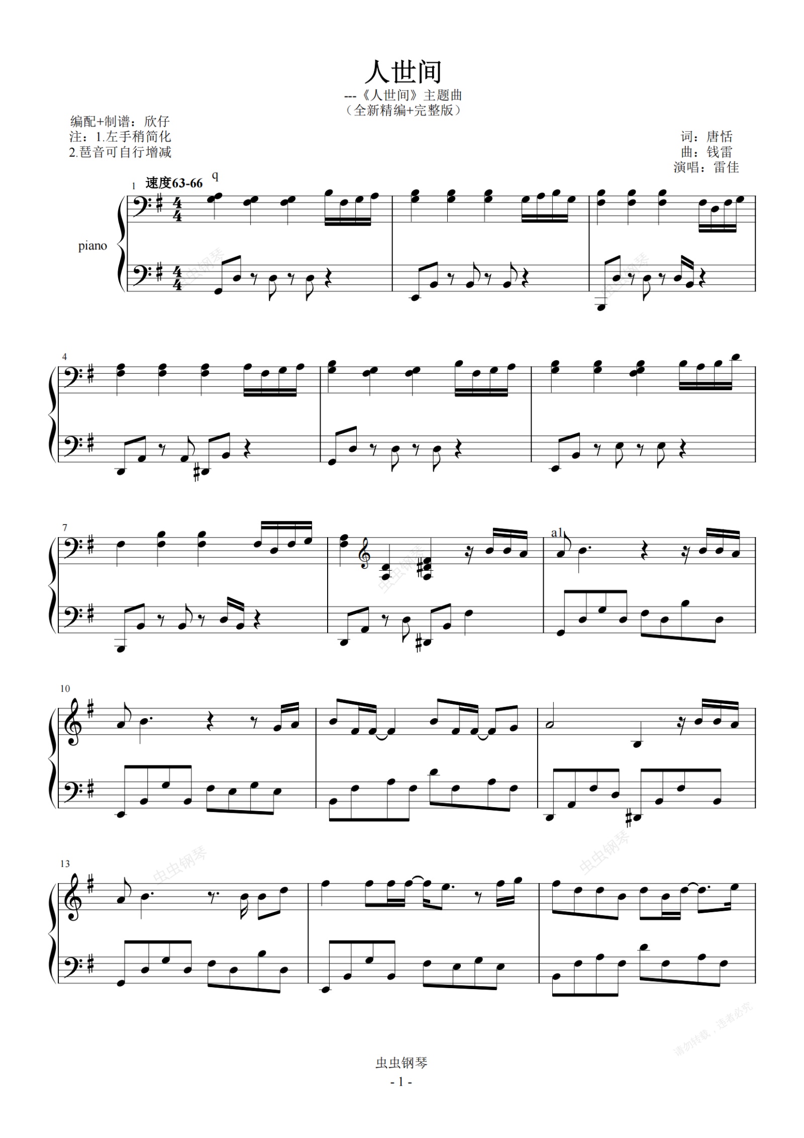 钢琴谱:雷佳-G《人世间》(全新精编+完整版、《人世间》主题曲)