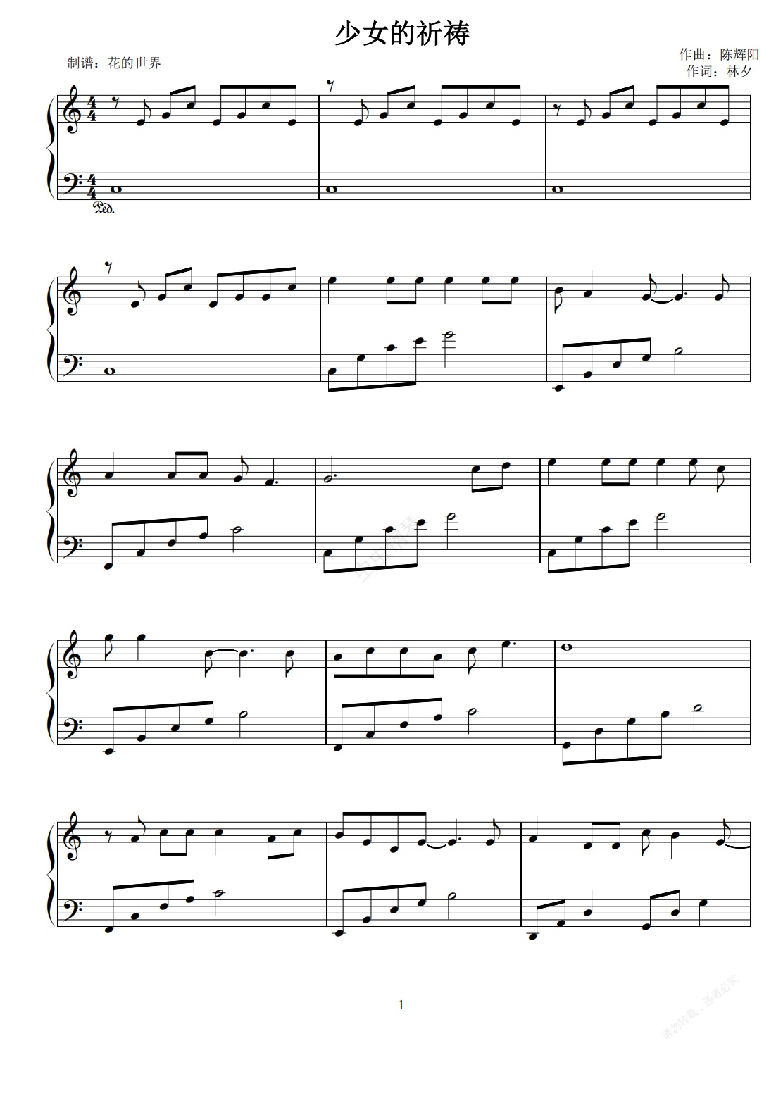 钢琴谱:少女的祈祷 C调简易版 杨千嬅 流行经典