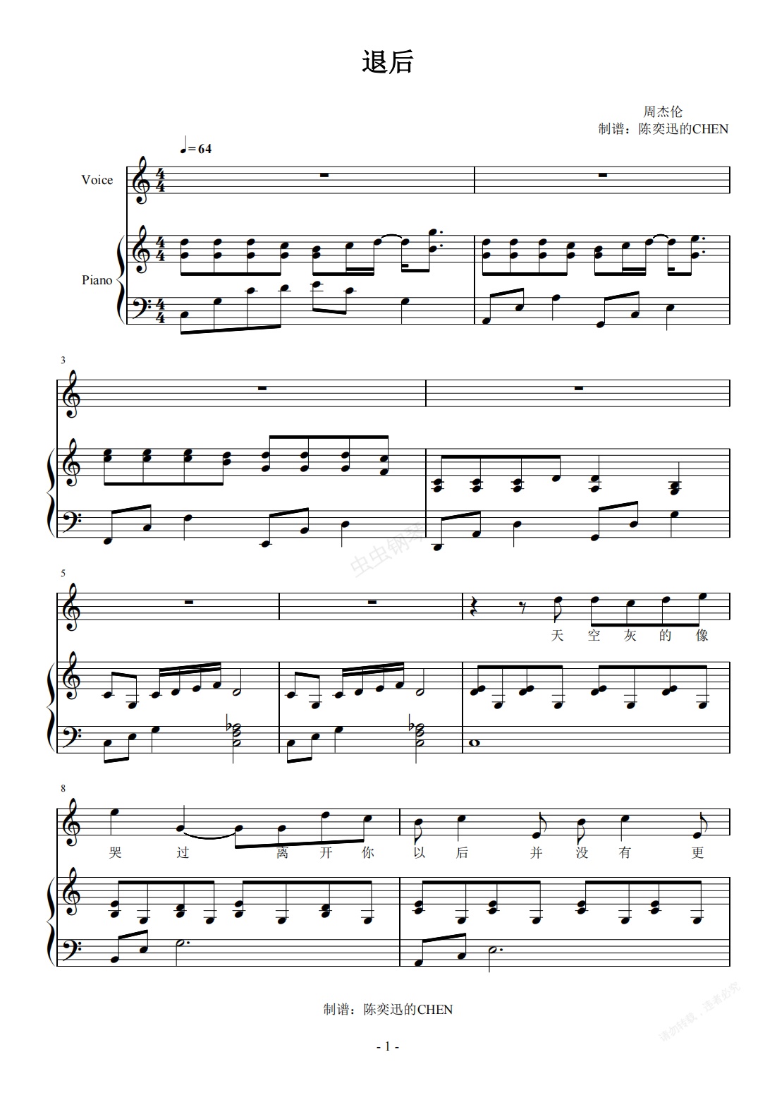 钢琴谱:退后 C调完美弹唱谱【附歌词】