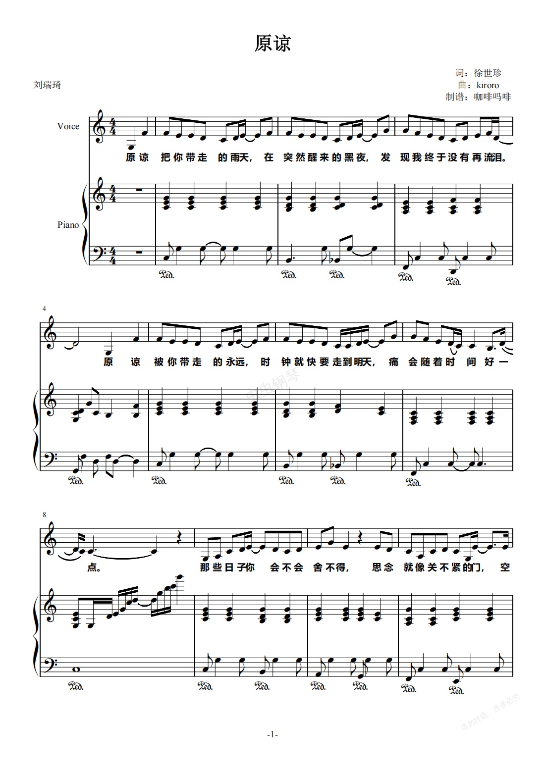 钢琴谱:原谅-刘瑞琦 钢琴伴奏谱