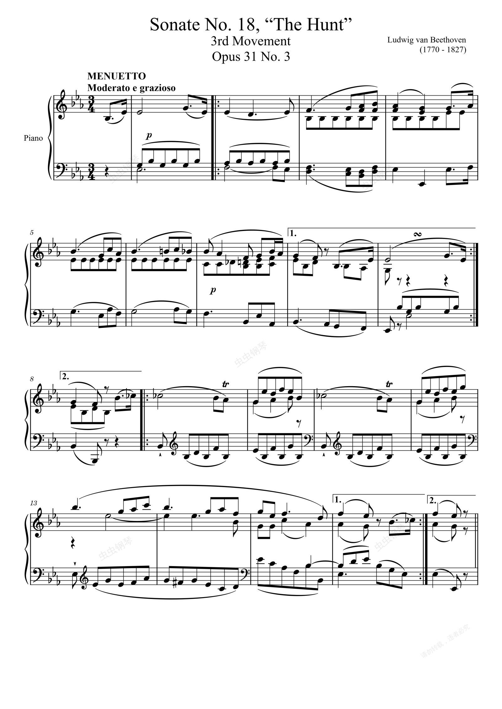 钢琴谱:贝多芬降E大调第十八钢琴奏鸣曲 第三乐章 Sonate No. 18, “The Hunt” 3rd Movement