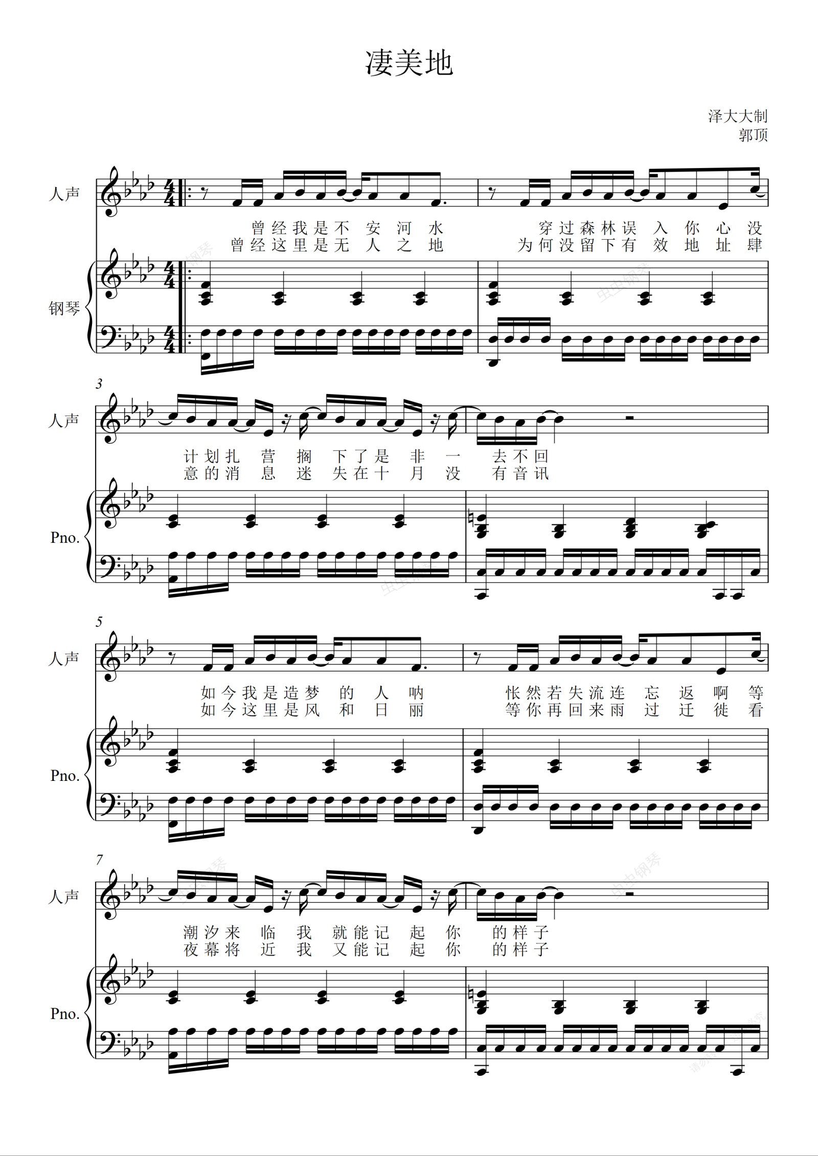 钢琴谱:凄美地【原版弹唱附词】泽大大 郭顶