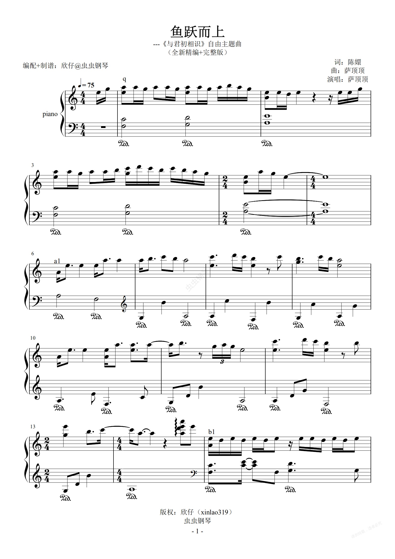 钢琴谱:萨顶顶-C《鱼跃而上》(《与君初相识》自由主题曲、完整版+全新精编)