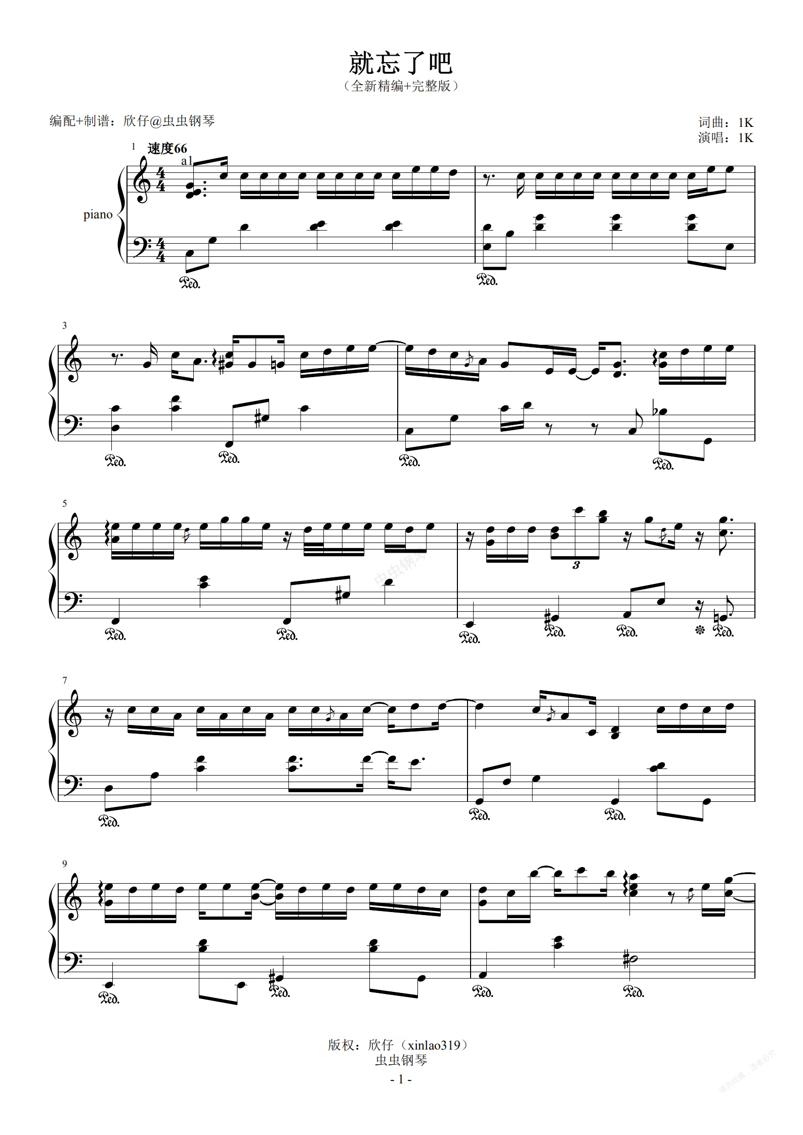 钢琴谱:1K-C《就忘了吧》(全新精编+完整版)