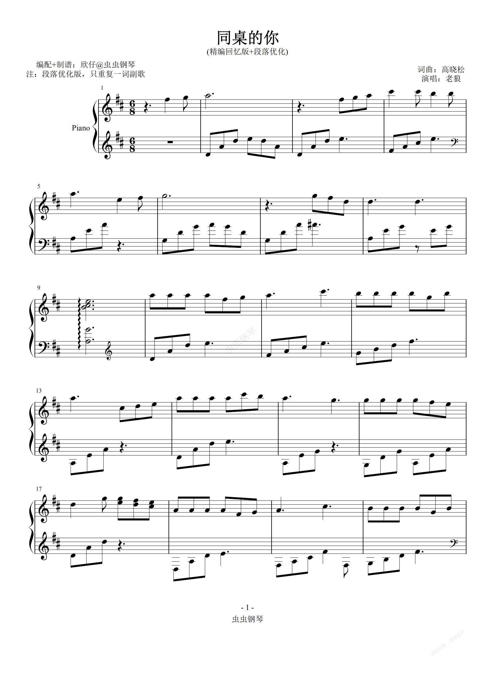 钢琴谱:精编回忆版-D《同桌的你》(原唱:老狼、段落优化)