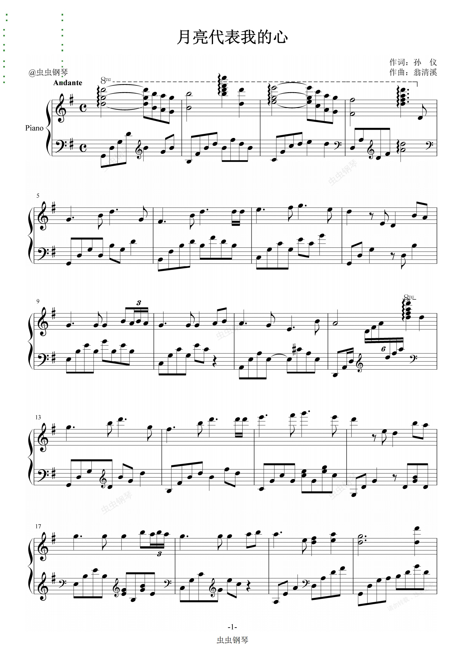 钢琴谱:月亮代表我的心/G调/邓丽君