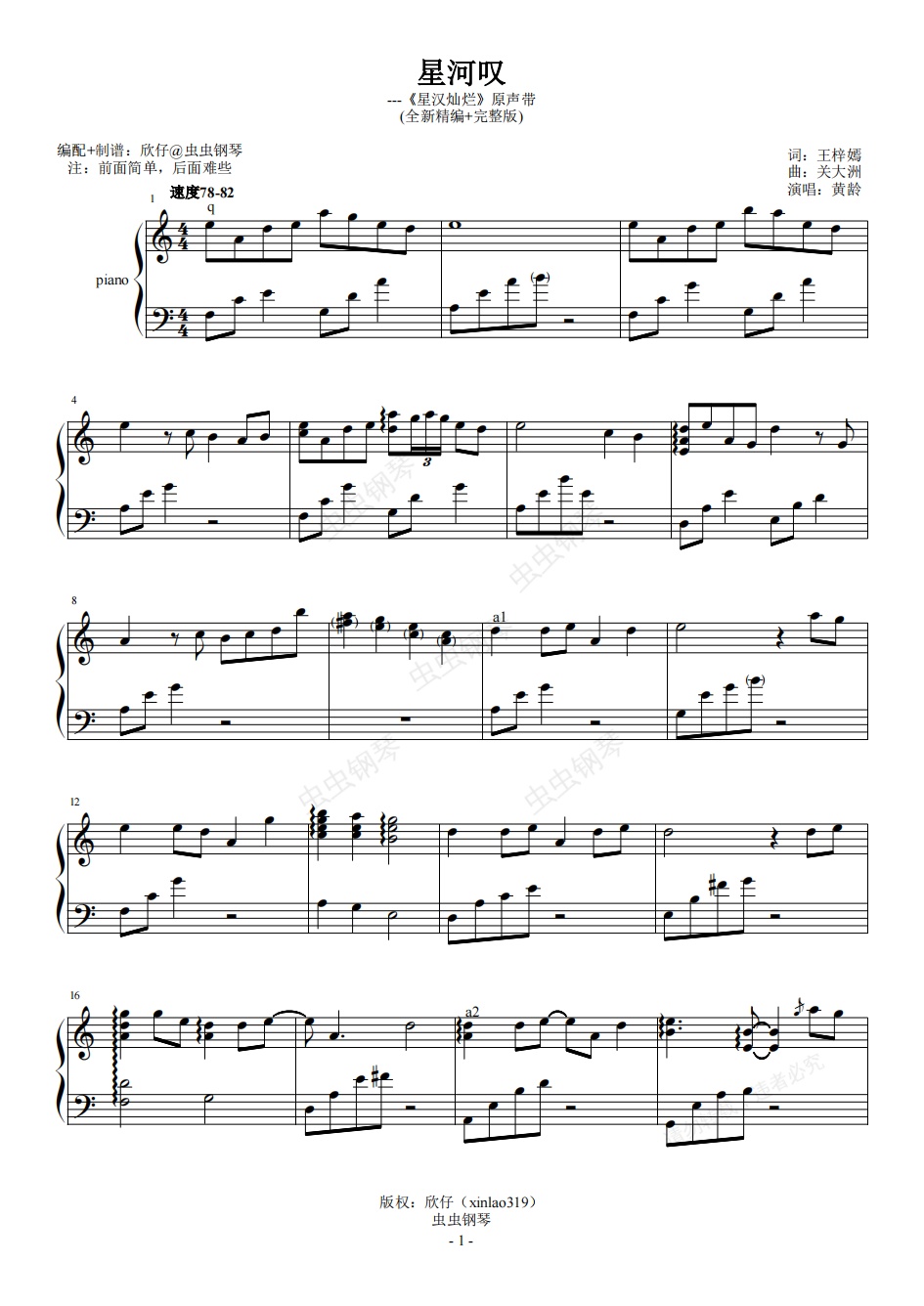 钢琴谱:黄龄-C《星河叹》(《星汉灿烂》原声带、完整版)