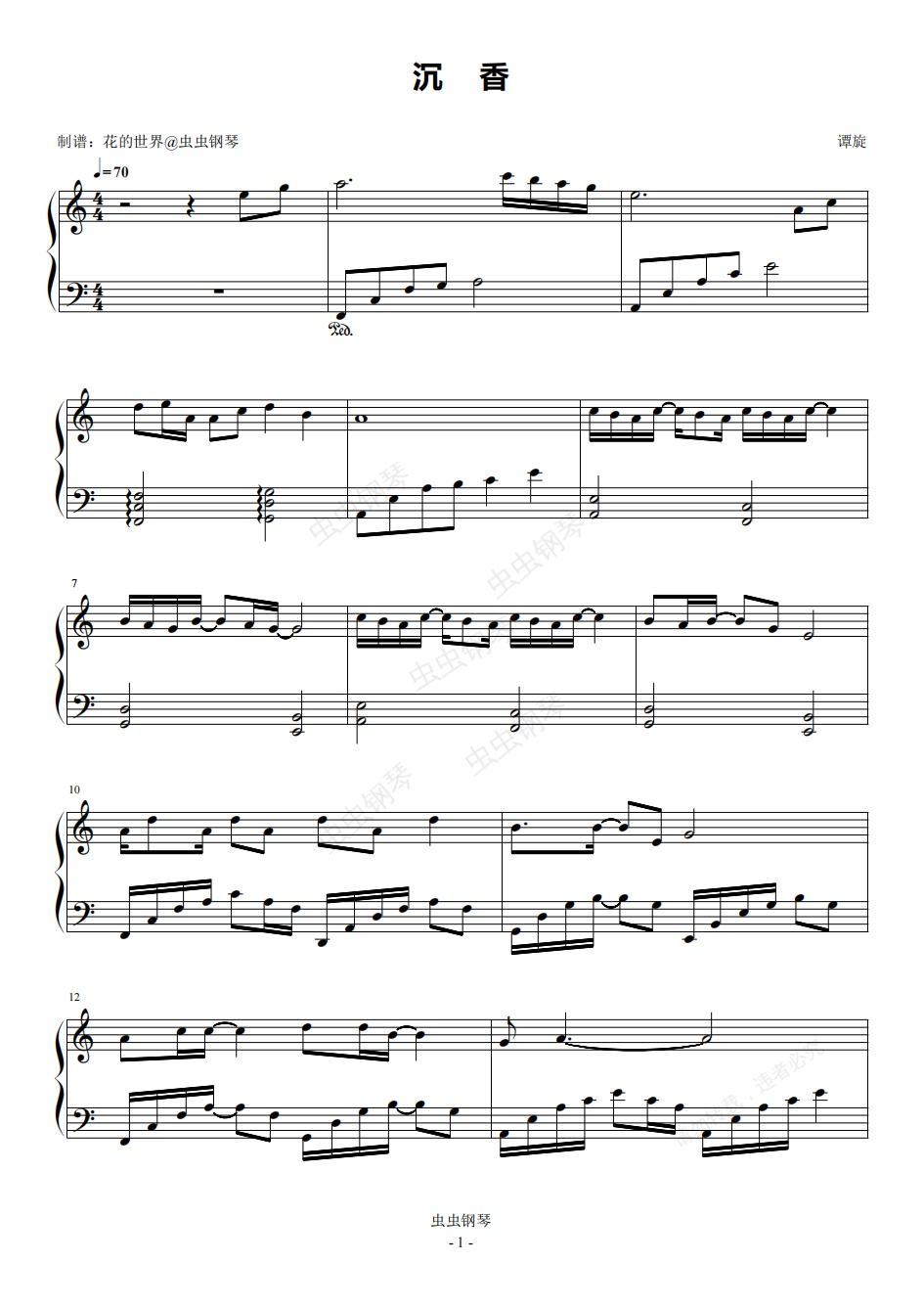 钢琴谱:沉香 C调简易版 沉香如屑 张杰/张靓颖
