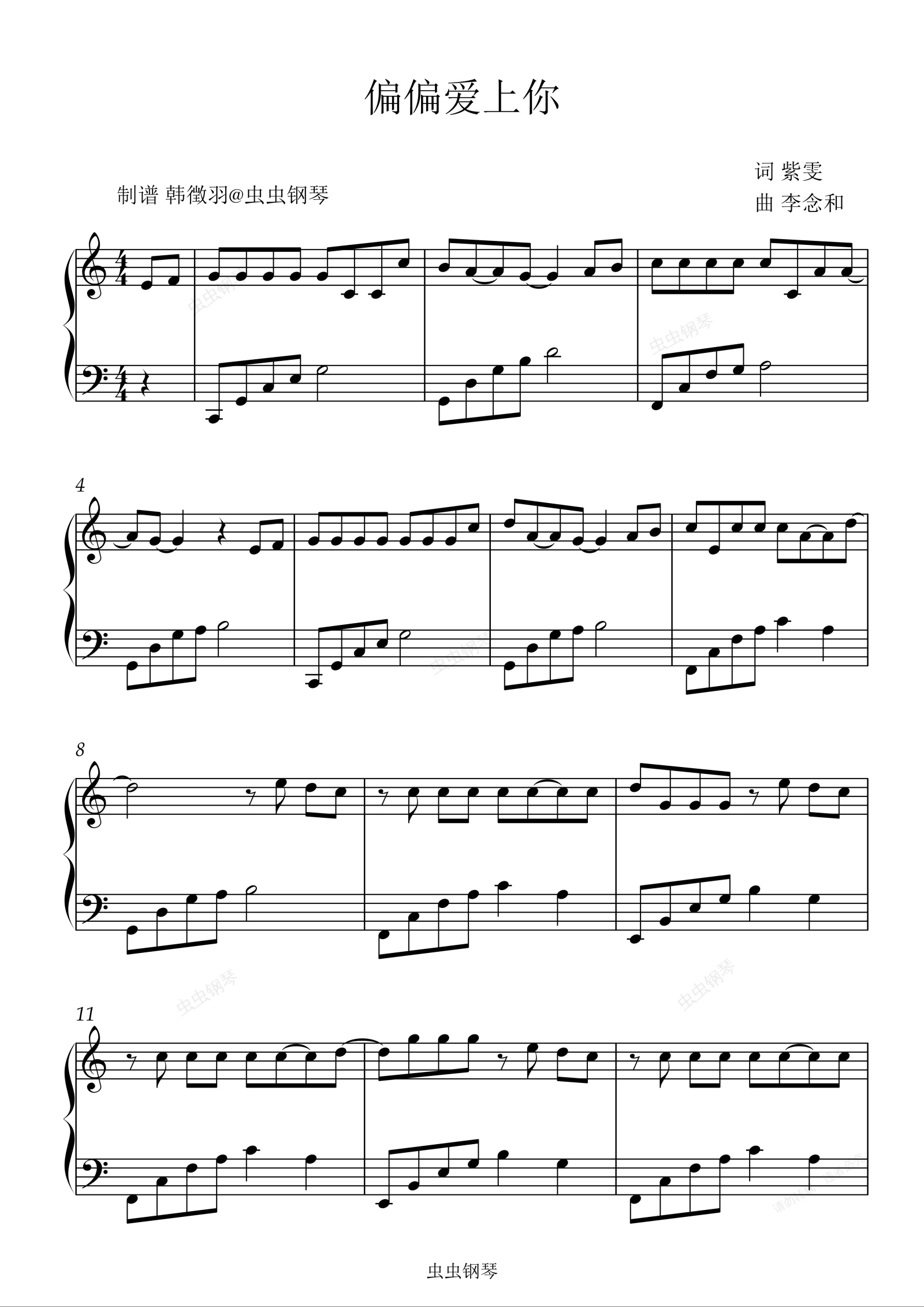 钢琴谱:吴建飞 偏偏爱上你C调简单易弹