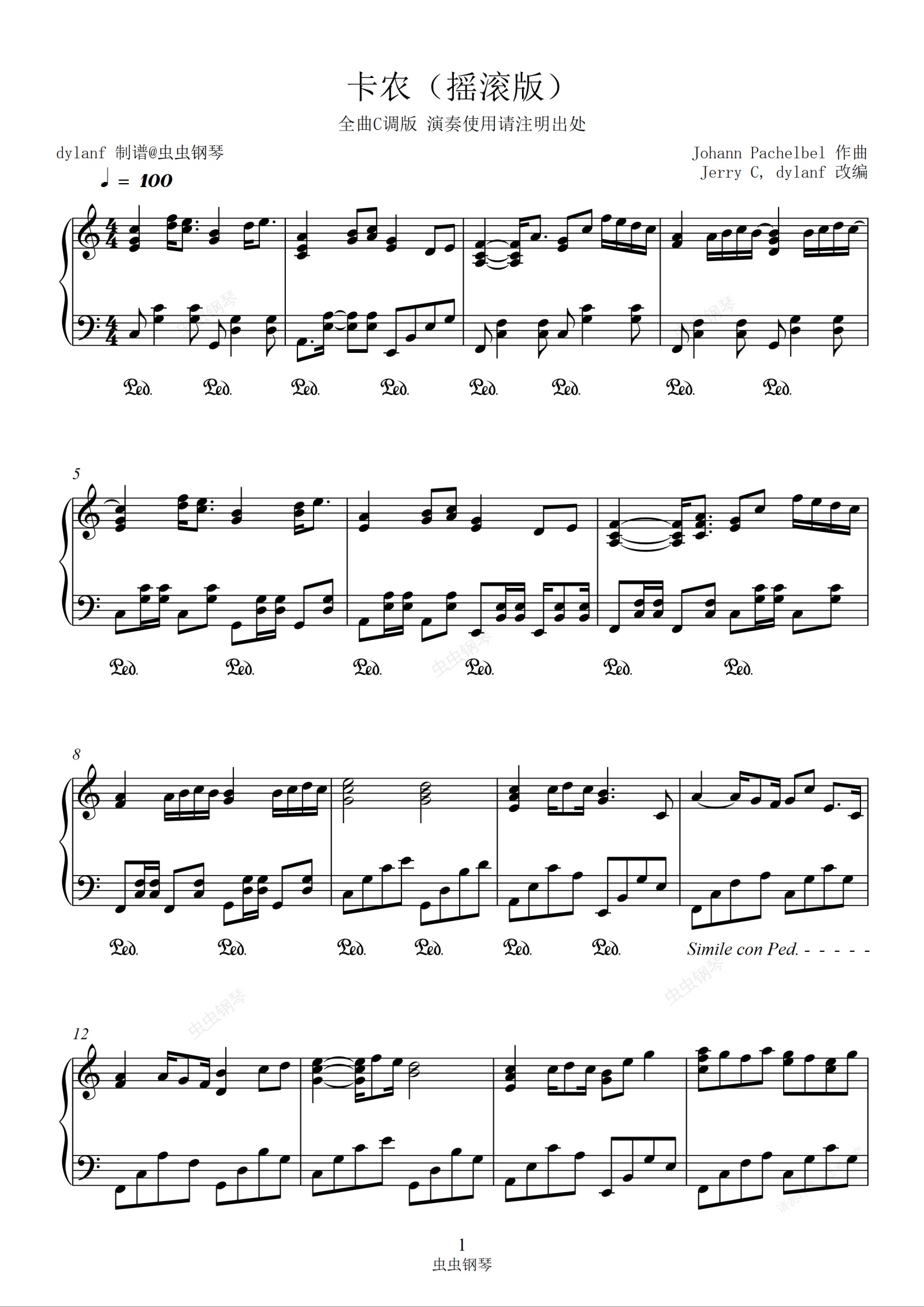 钢琴谱:卡农C调(摇滚版)超燃热血dylanf经典卡农Canon in D Major张逸凡Jerry C D大调卡农