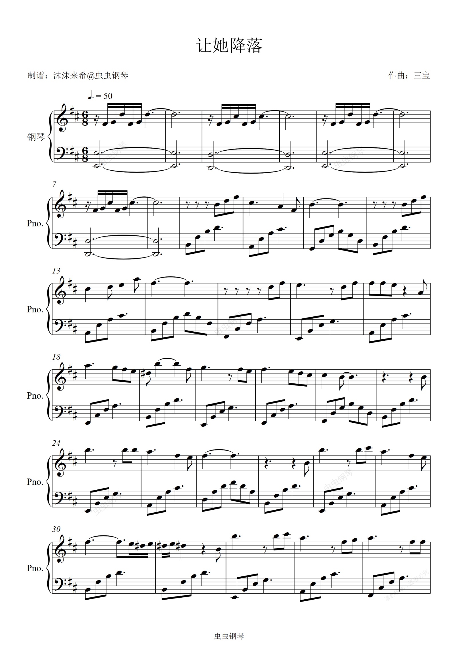 钢琴谱:《让她降落》金粉世家片尾曲 D调简单