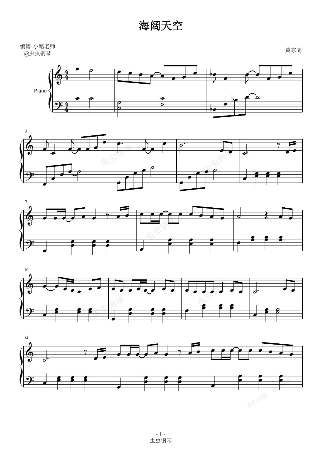 钢琴谱:海阔天空 【简易 动听】