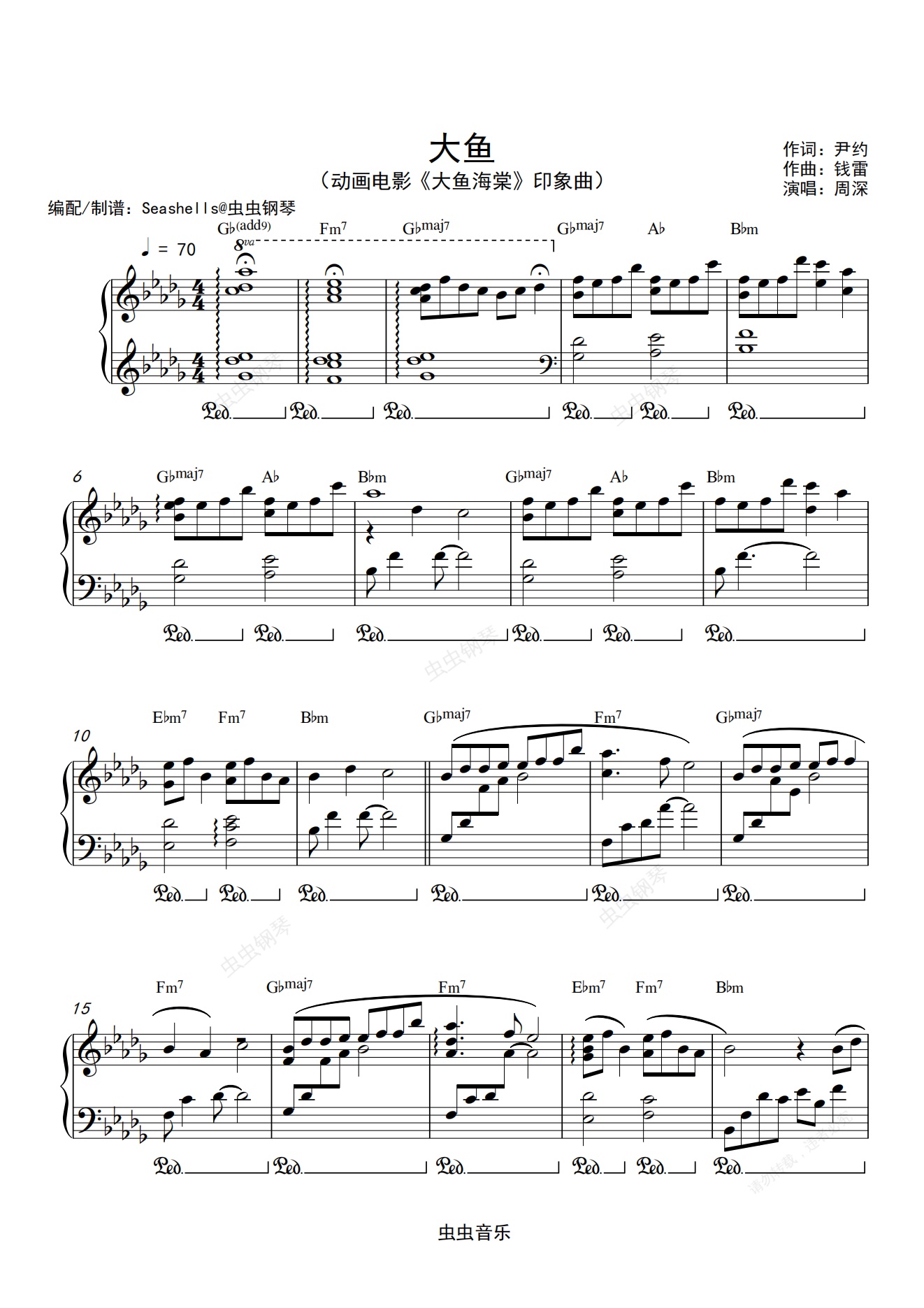 钢琴谱:周深-《大鱼》精编钢琴独奏 降D调